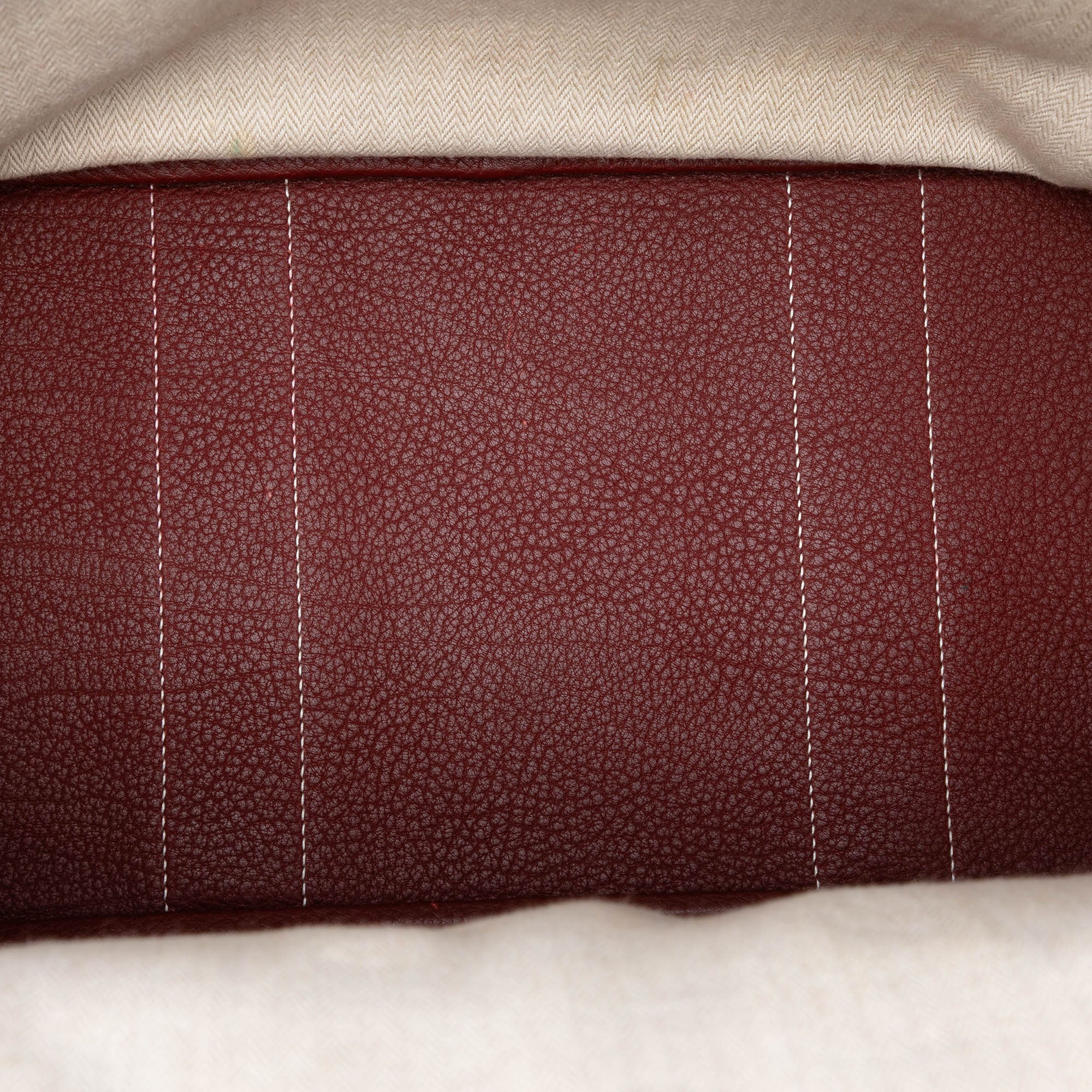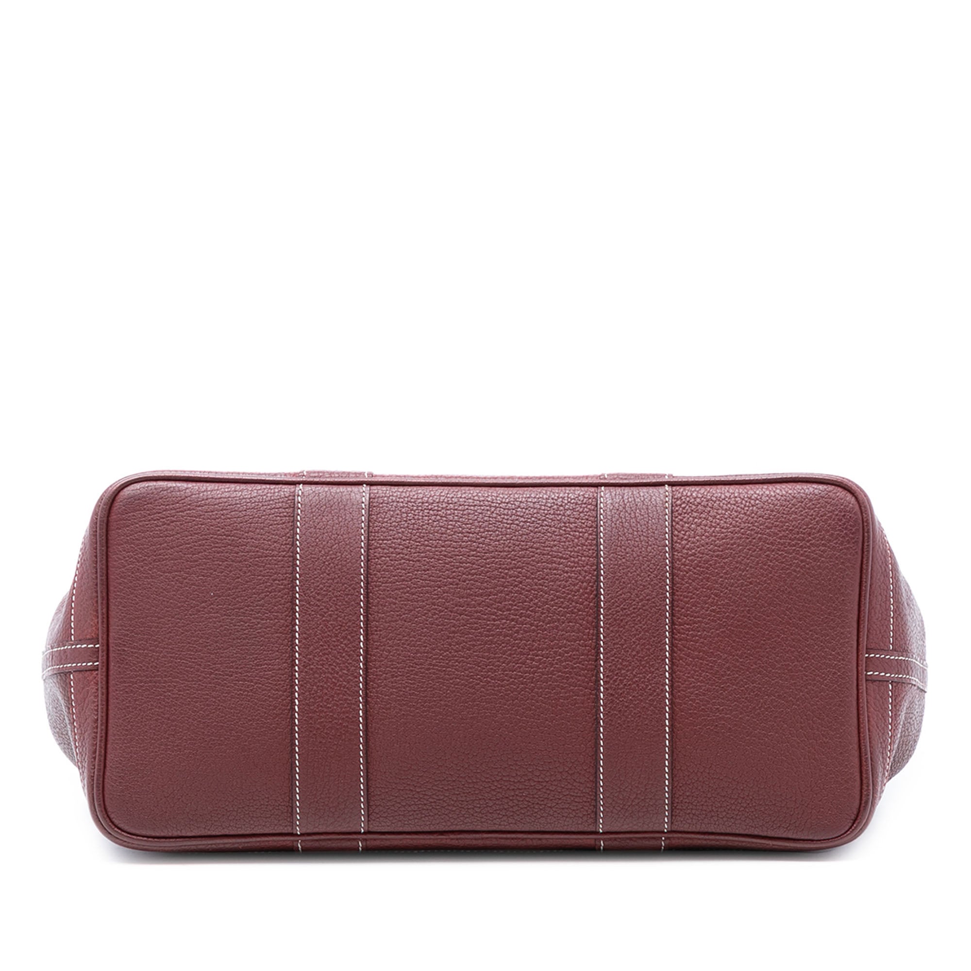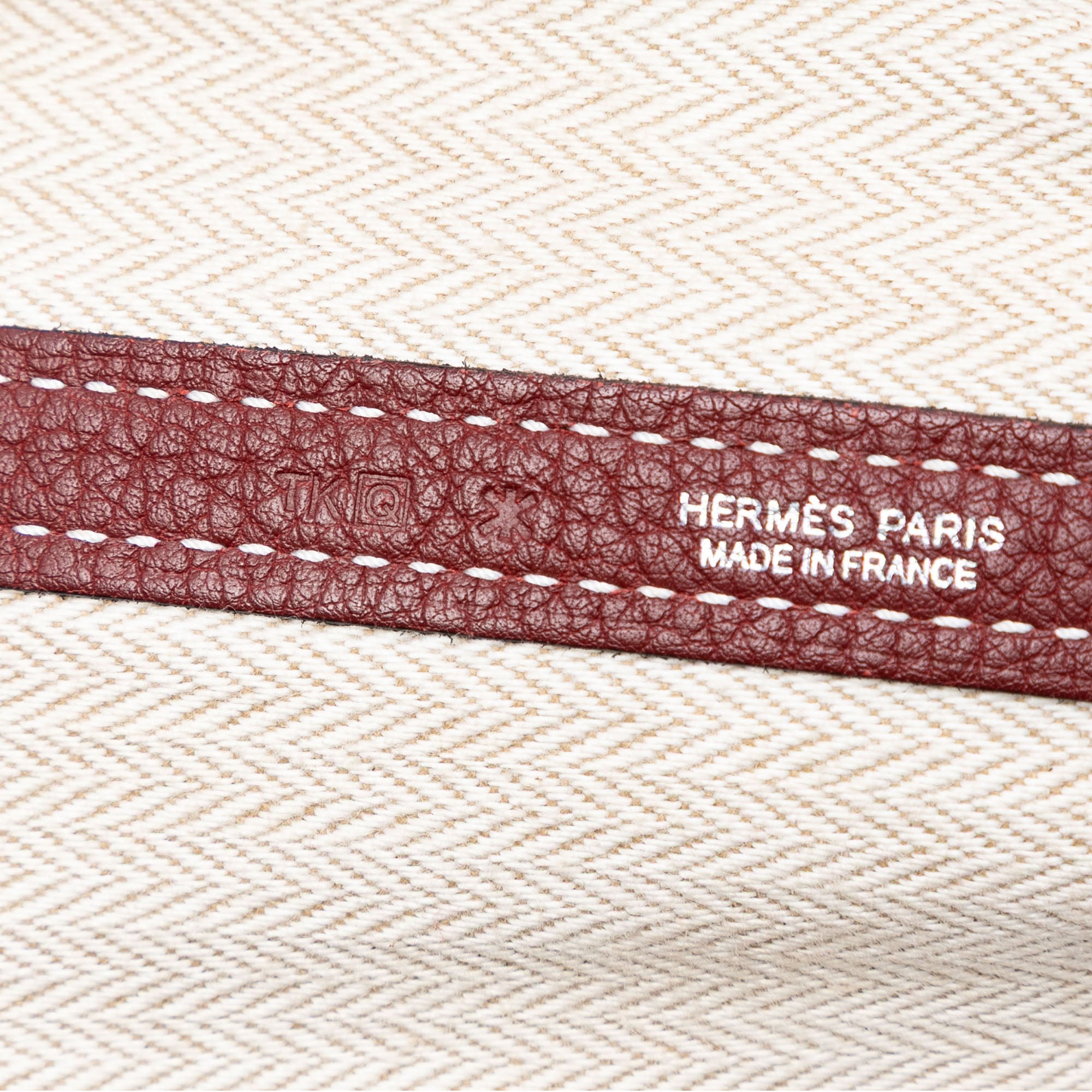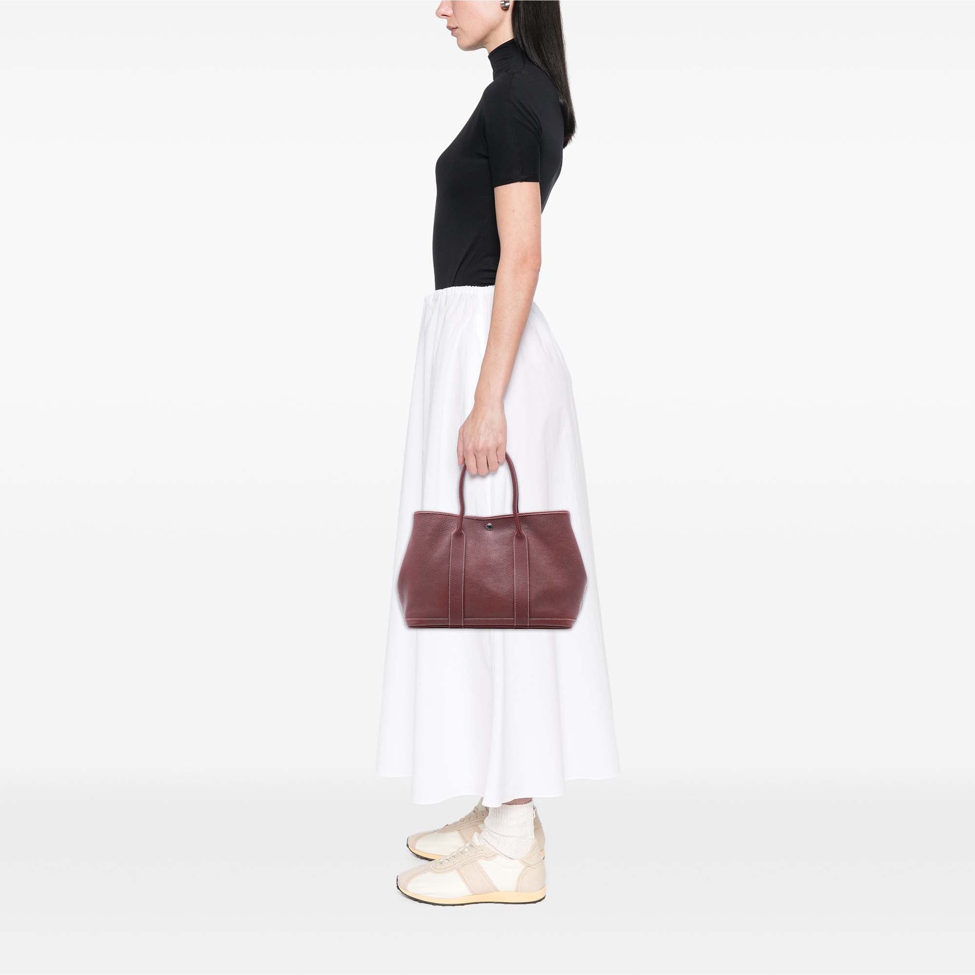 This Garden Party features a Negonda leather body in Rouge H color, rolled leather handles, a top snap button clasp closure, and an interior zip pocket.