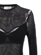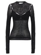 Designed with a classic crew neckline and long sleeves, this top balances edgy design with wearable sophistication. The semi-sheer mesh construction and strategic cut-outs add an element of intrigue while maintaining a refined aesthetic.