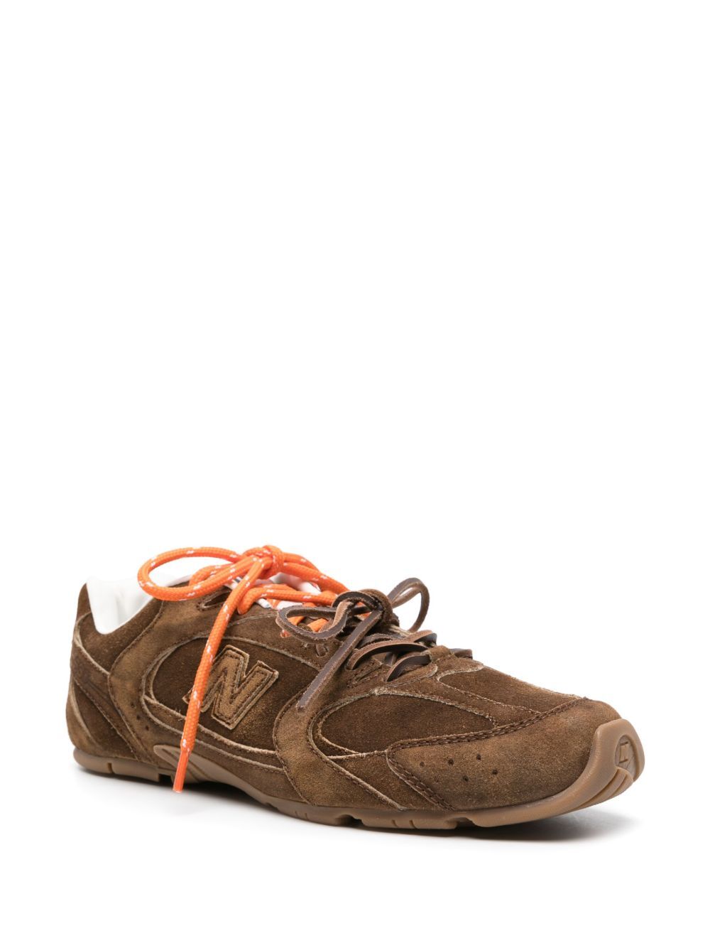 Crafted from premium suede and 100% calf leather, these low-top sneakers feature a rich brown colorway accented with vibrant orange laces for a playful pop of color. The iconic New Balance silhouette is reimagined through Miu Miu's distinctive lens, creating a statement piece that effortlessly transitions from casual daytime looks to elevated off-duty styling.