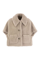 BOXY CAP MADE OF ALPACA AND WOOL TEDDY FABRIC ON A SILK BASE, WITH A WIDE SHIRT COLLAR THAT RESTS ON THE SHOULDERS. - SHORT KIMONO SLEEVES - FRONT 3 BUTTON CLOSURE - PATCH POCKETS ON THE FRONT - VISCOSE LINING DESIGNER ID: 2524736062600 002