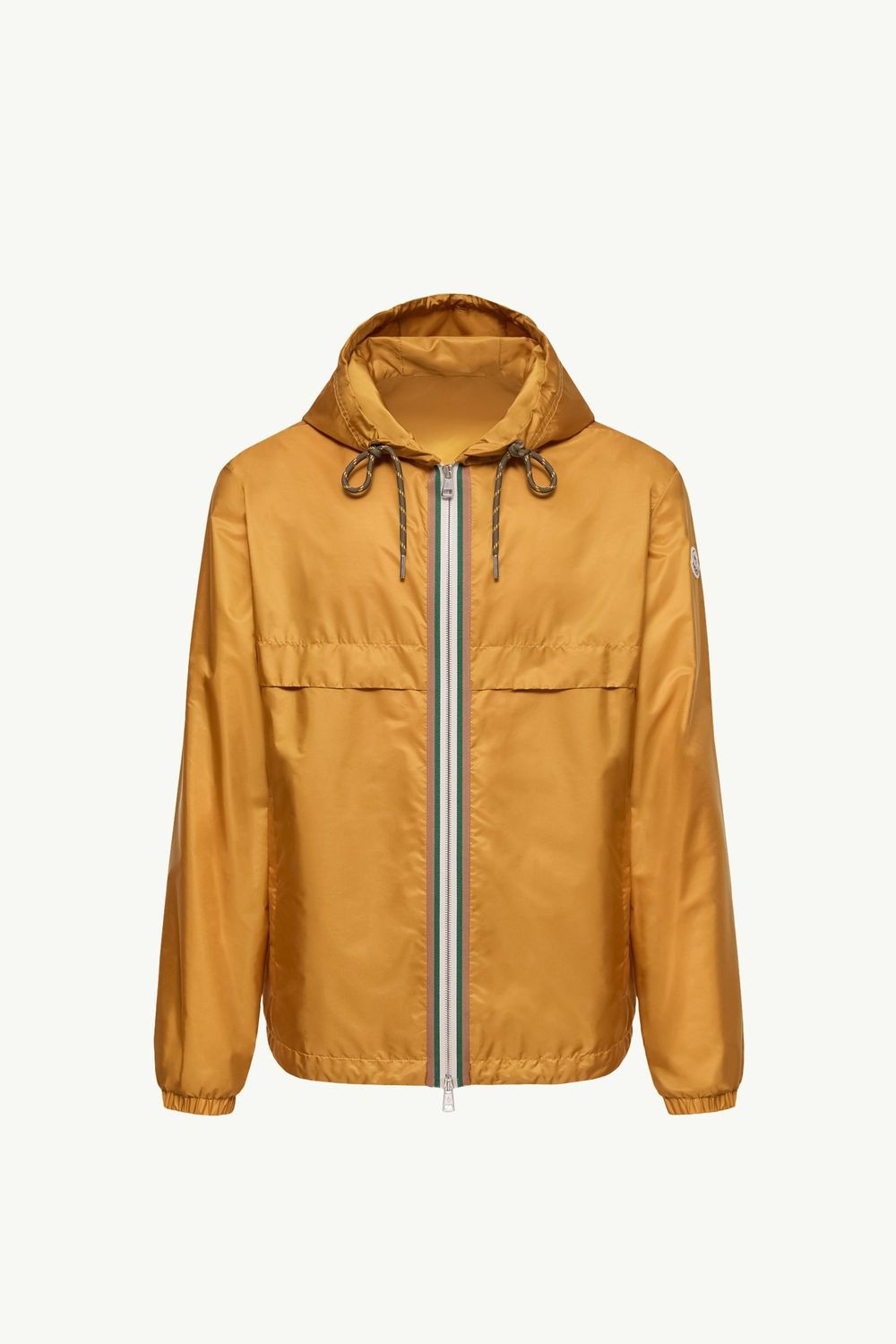 Elevate your transitional wardrobe with the Moncler Nidge Jacket, a versatile outerwear essential crafted in a vibrant golden yellow hue. This lightweight windbreaker features a practical hooded design with adjustable drawstrings, dual chest pockets, and a sleek two-way zipper closure for customizable styling.