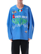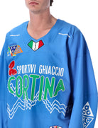 THE ACG HOCKEY JERSEY BY NIKE REIMAGINES ICE HERITAGE THROUGH BOLD GRAPHIC EXPRESSION. CRAFTED FROM LIGHTWEIGHT TECHNICAL FABRIC, IT FEATURES THE “SPORTIVI GHIACCIO CORTINA” FRONT PRINT ENHANCED BY A CONTRASTING TOPOGRAPHIC MOTIF INSPIRED BY ALPINE LANDSCAPES. APPLIED PATCHES AND SIGNATURE ACG DETAILS ELEVATE THE DESIGN, WHILE BREATHABLE SIDE INSERTS ENSURE LASTING COMFORT AND MOBILITY.