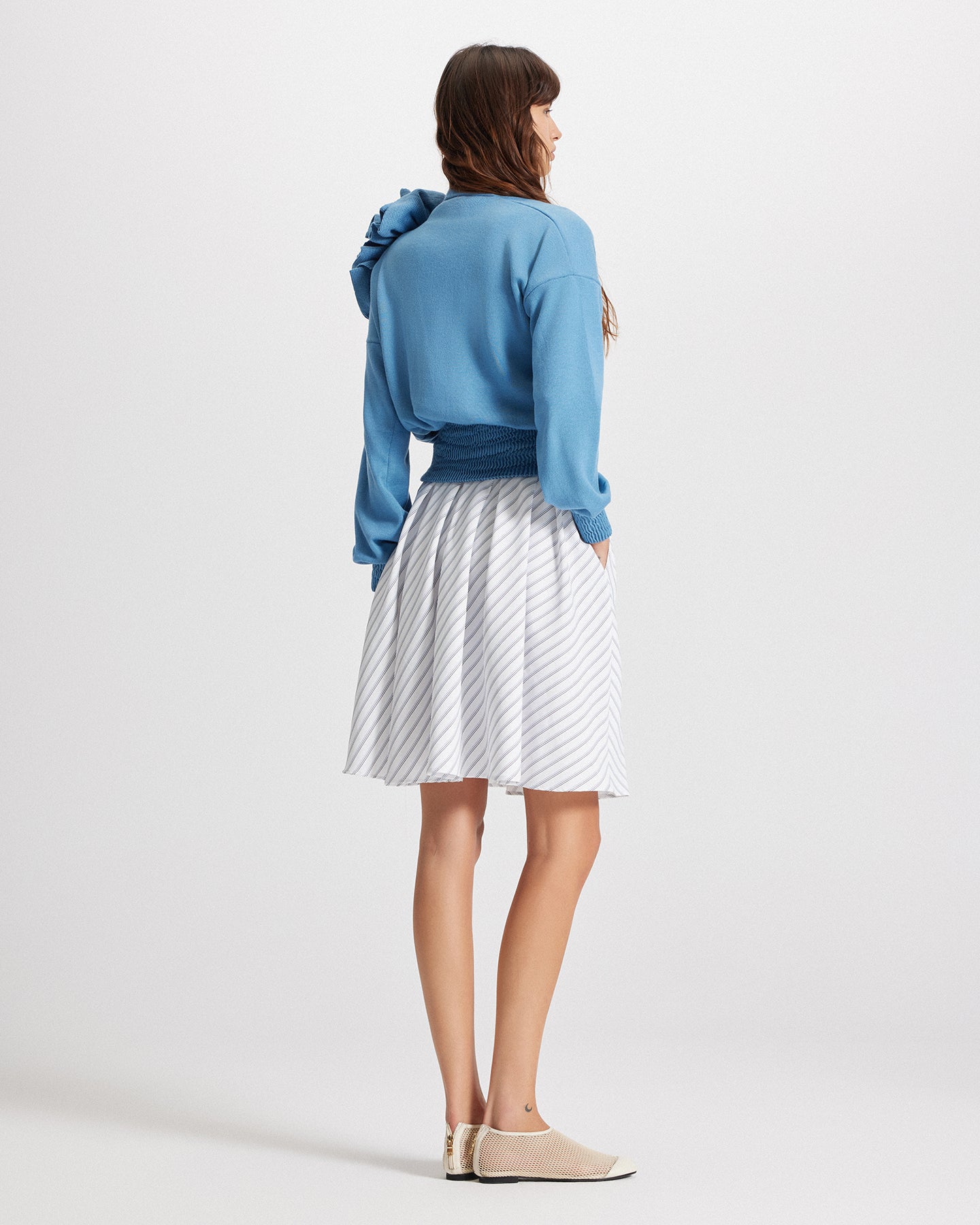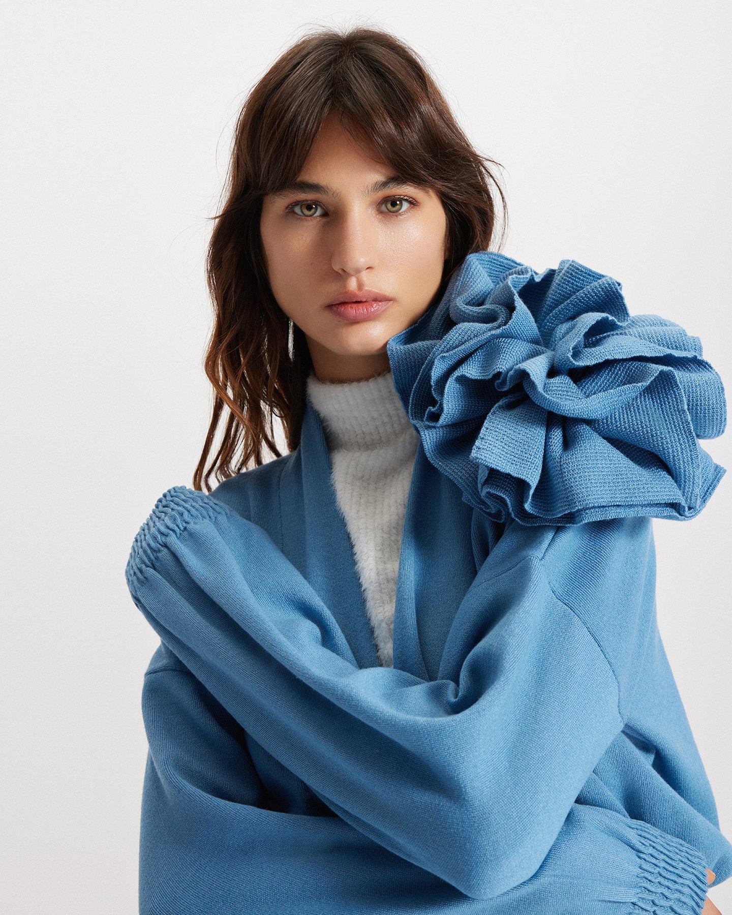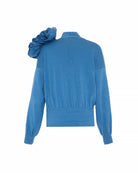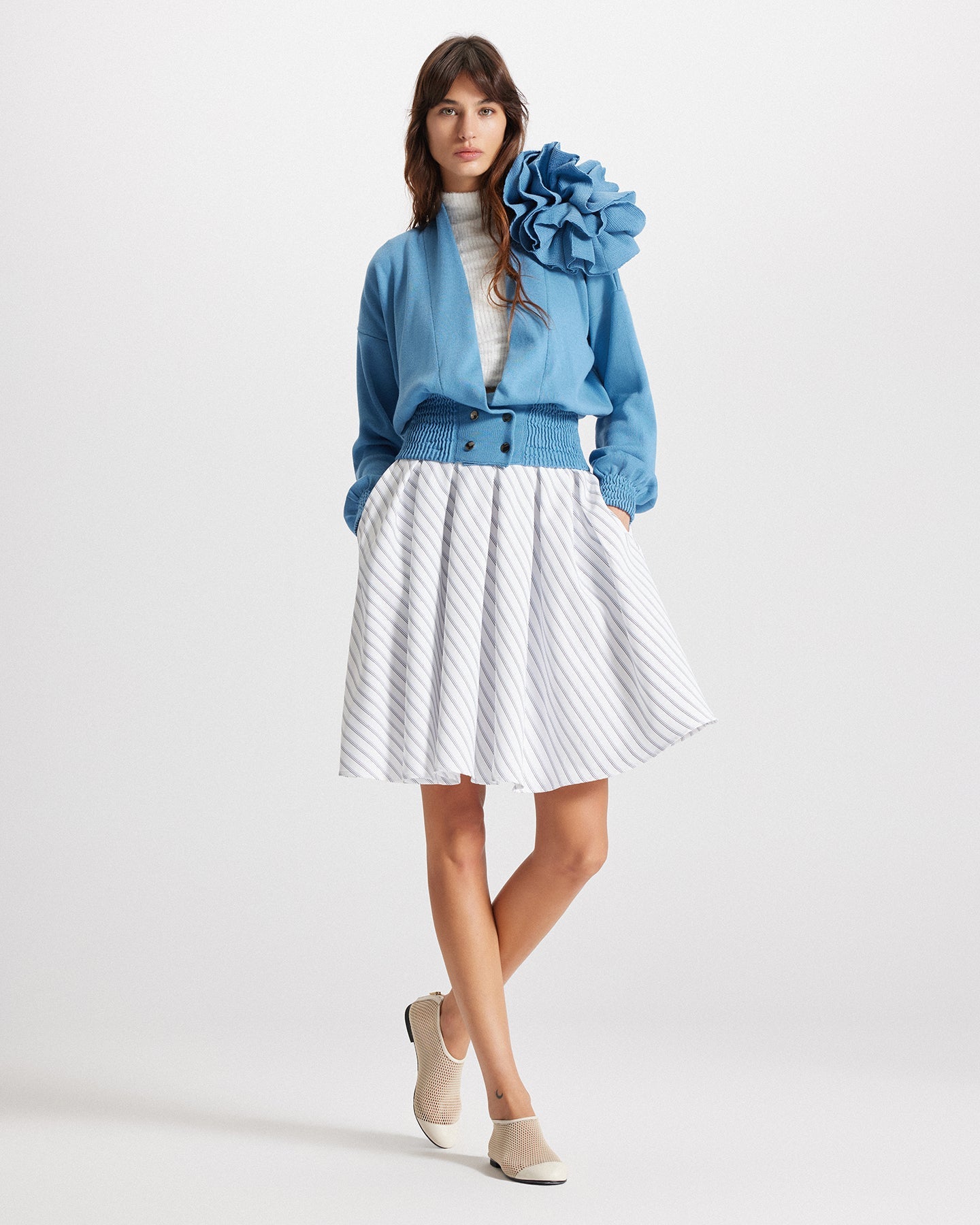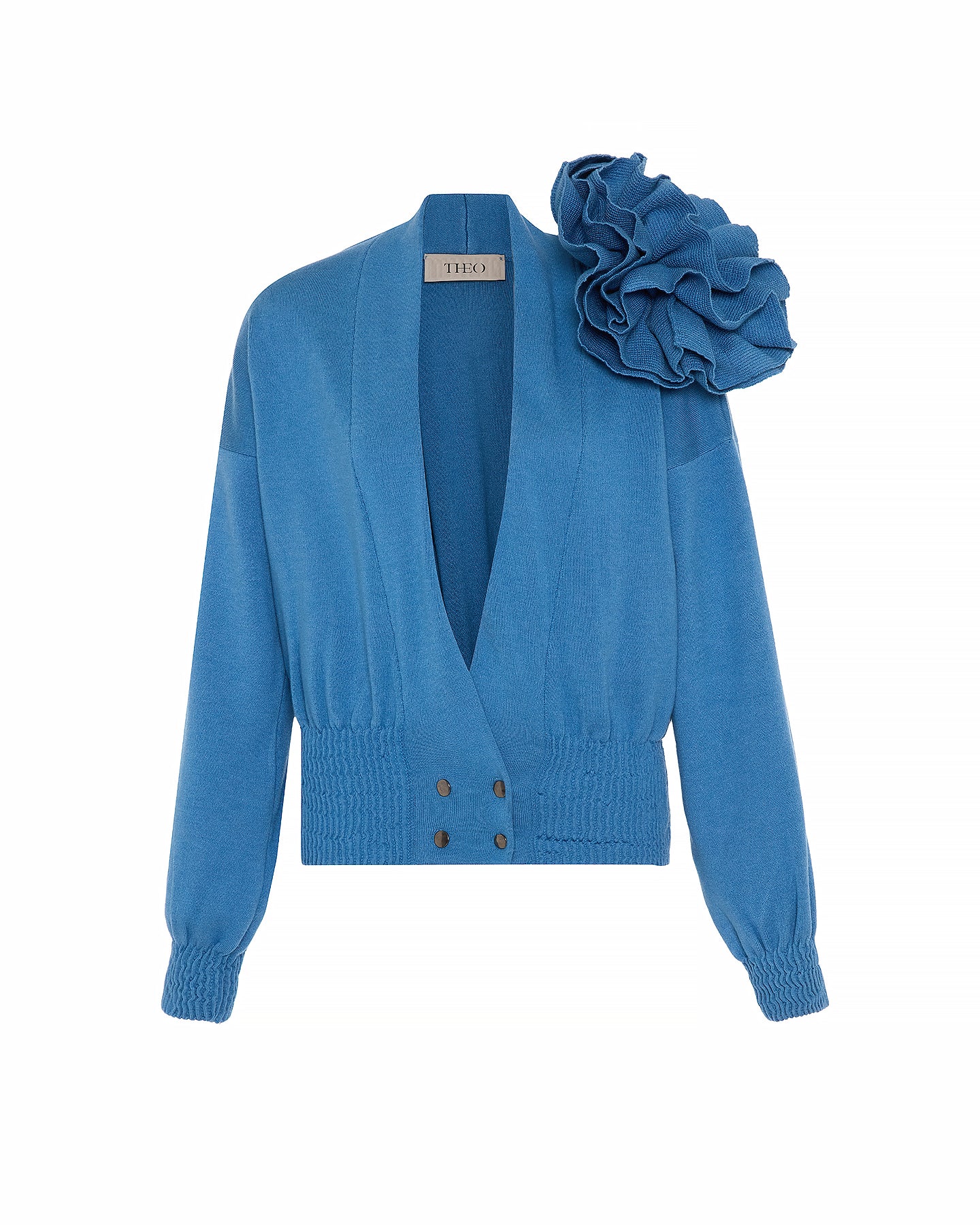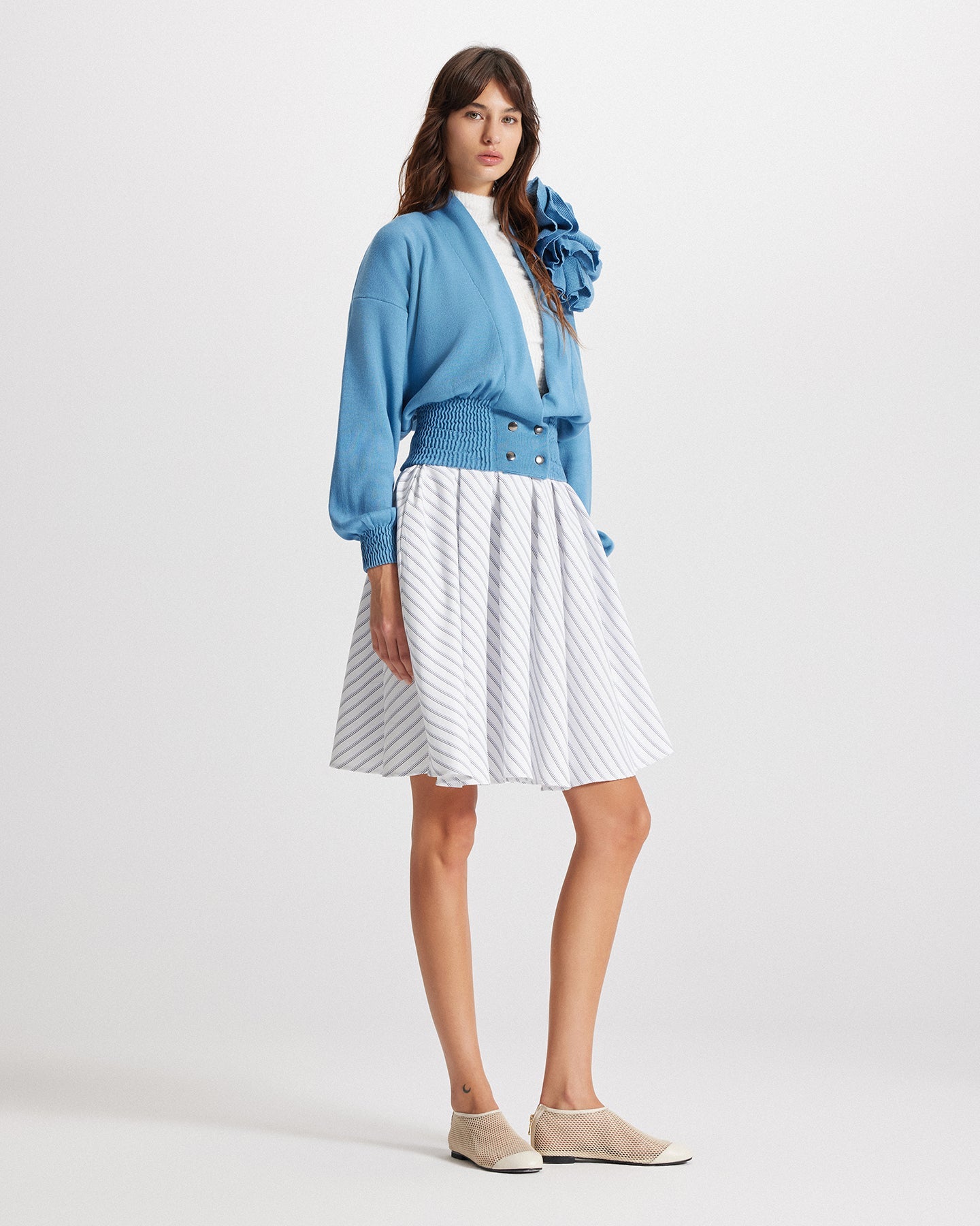 This cropped knit cardigan features a hand-embroidered tonal rosette and a sculpted ribbed waistband. With a deep V-neck and double-breasted front, it's a standout layering piece for elevated knitwear looks.