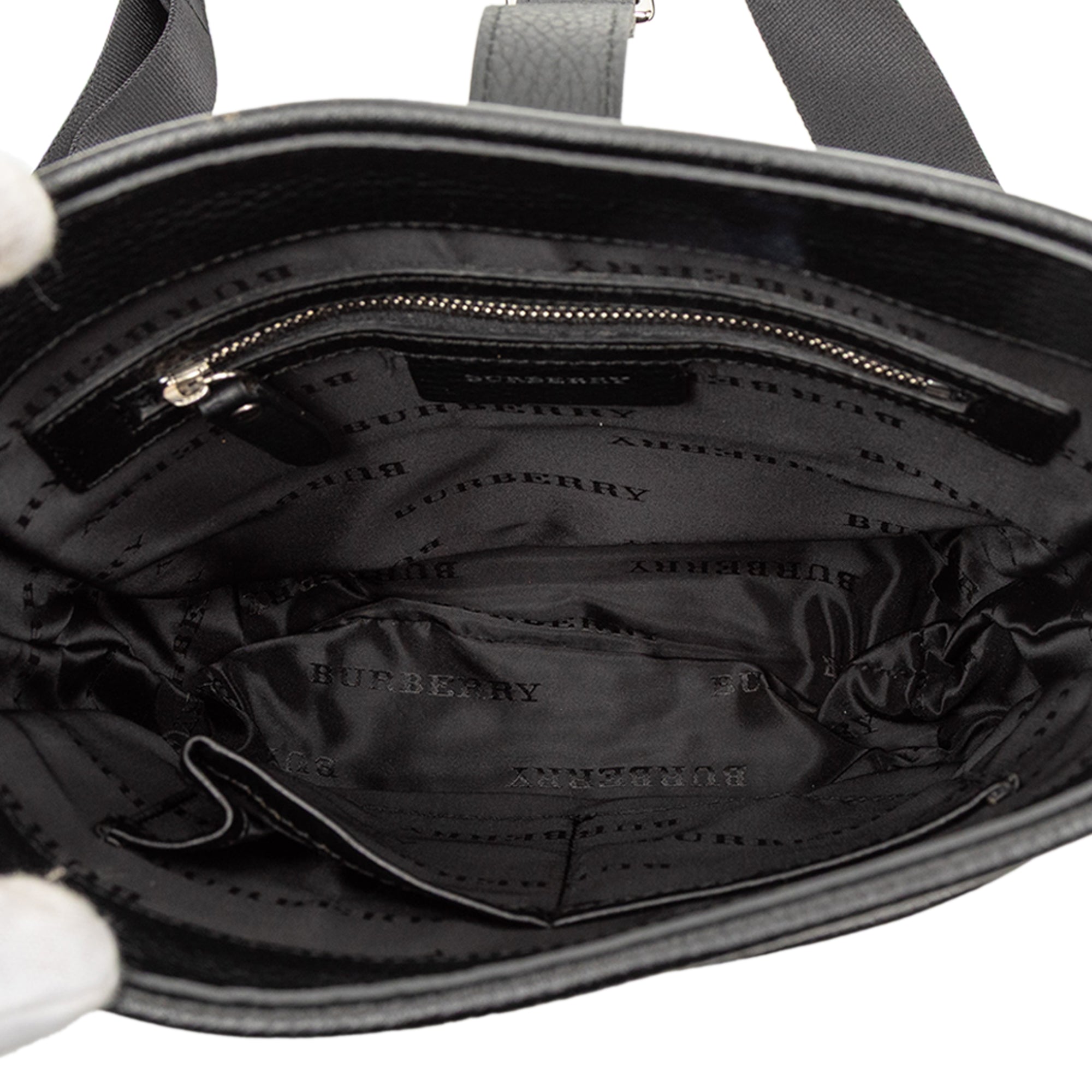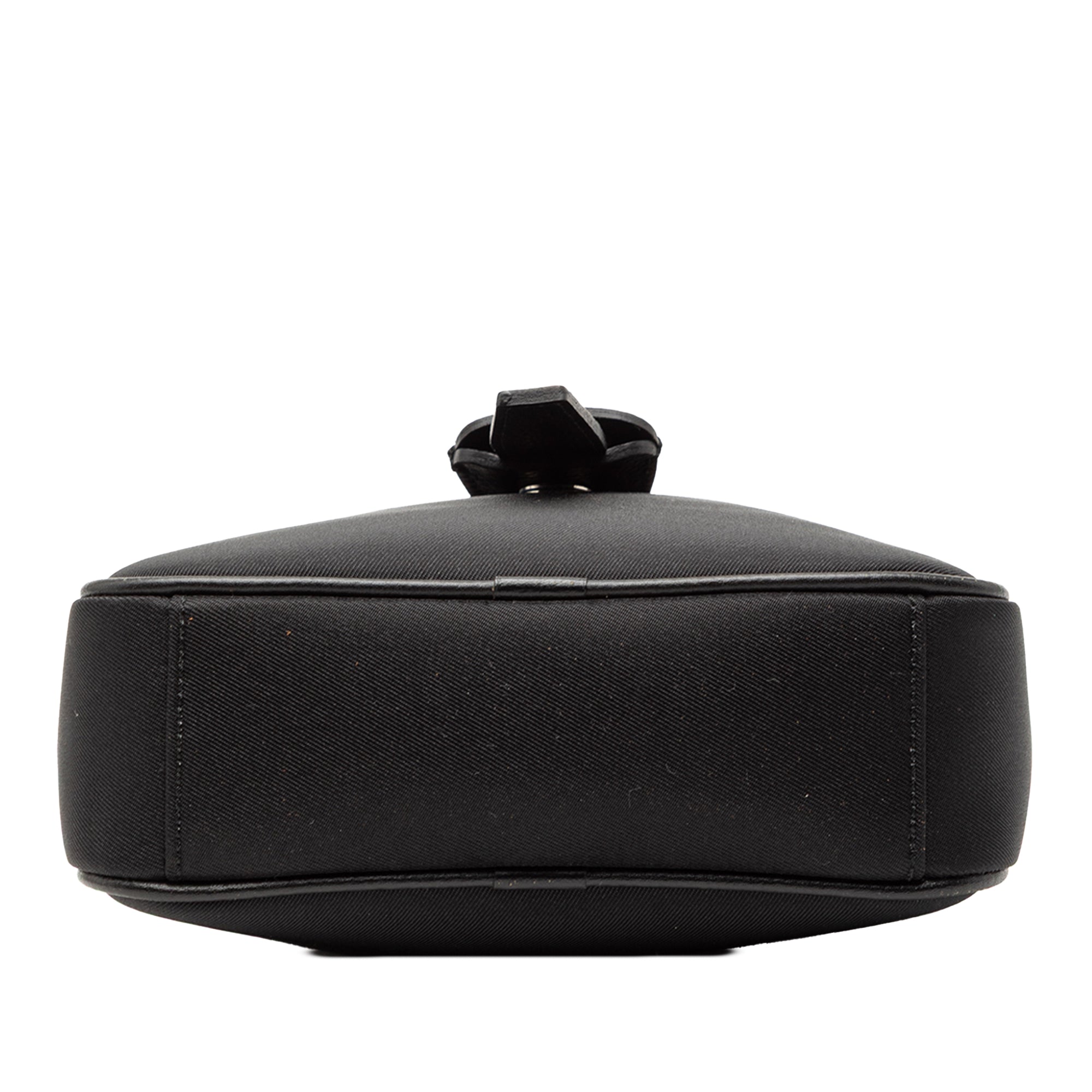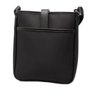 This crossbody bag features a nylon body with leather trim, an adjustable flat canvas strap, an open top with a flat strap and magnetic snap closure, exterior front and back slip pockets, and interior zip and slip pockets.