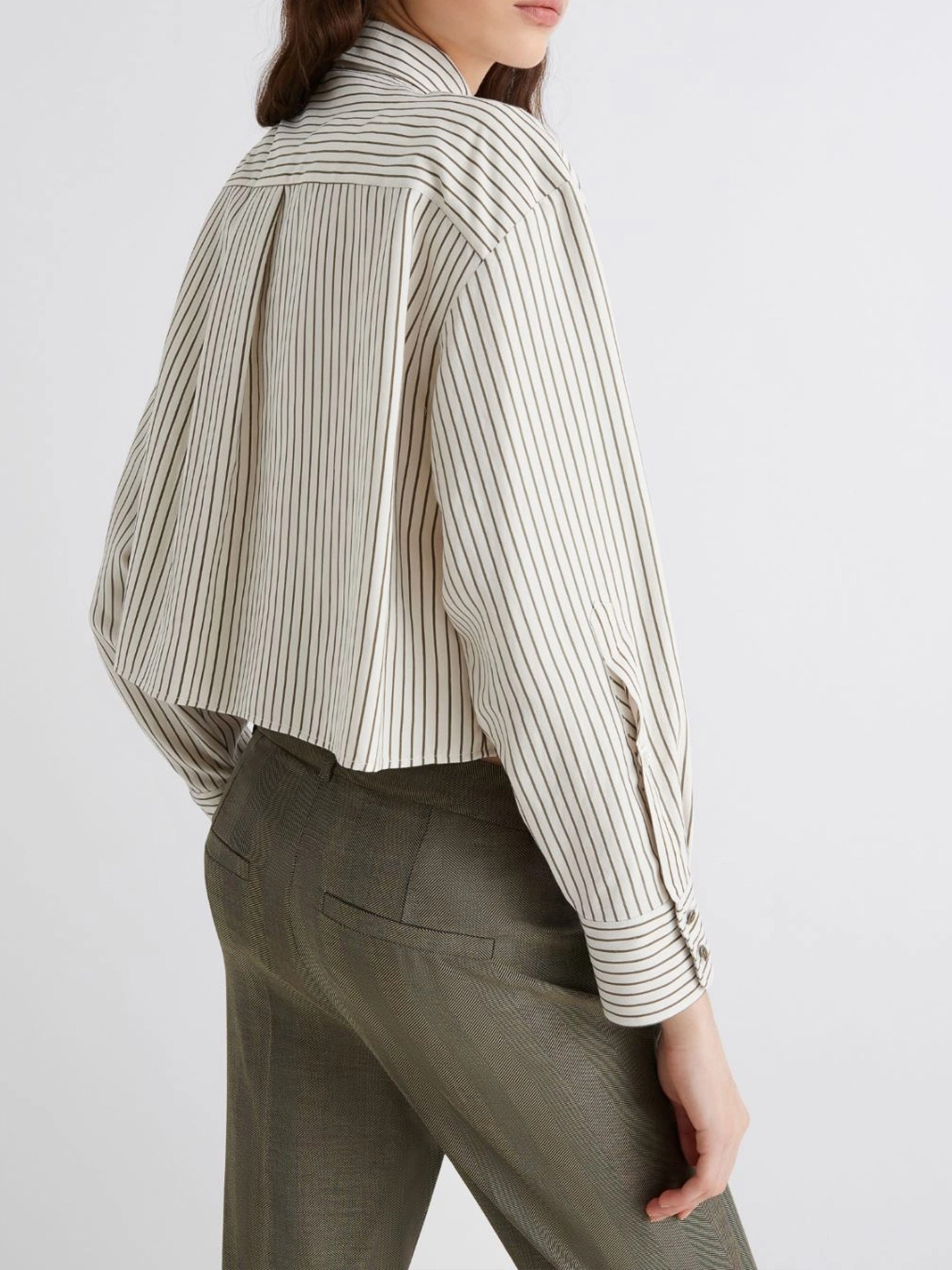 The cropped silhouette and structured shirt collar create a modern, polished look that transitions seamlessly from office to evening. Style it with high-waisted trousers for a chic professional ensemble, or pair it with your favorite denim for an elevated casual look.