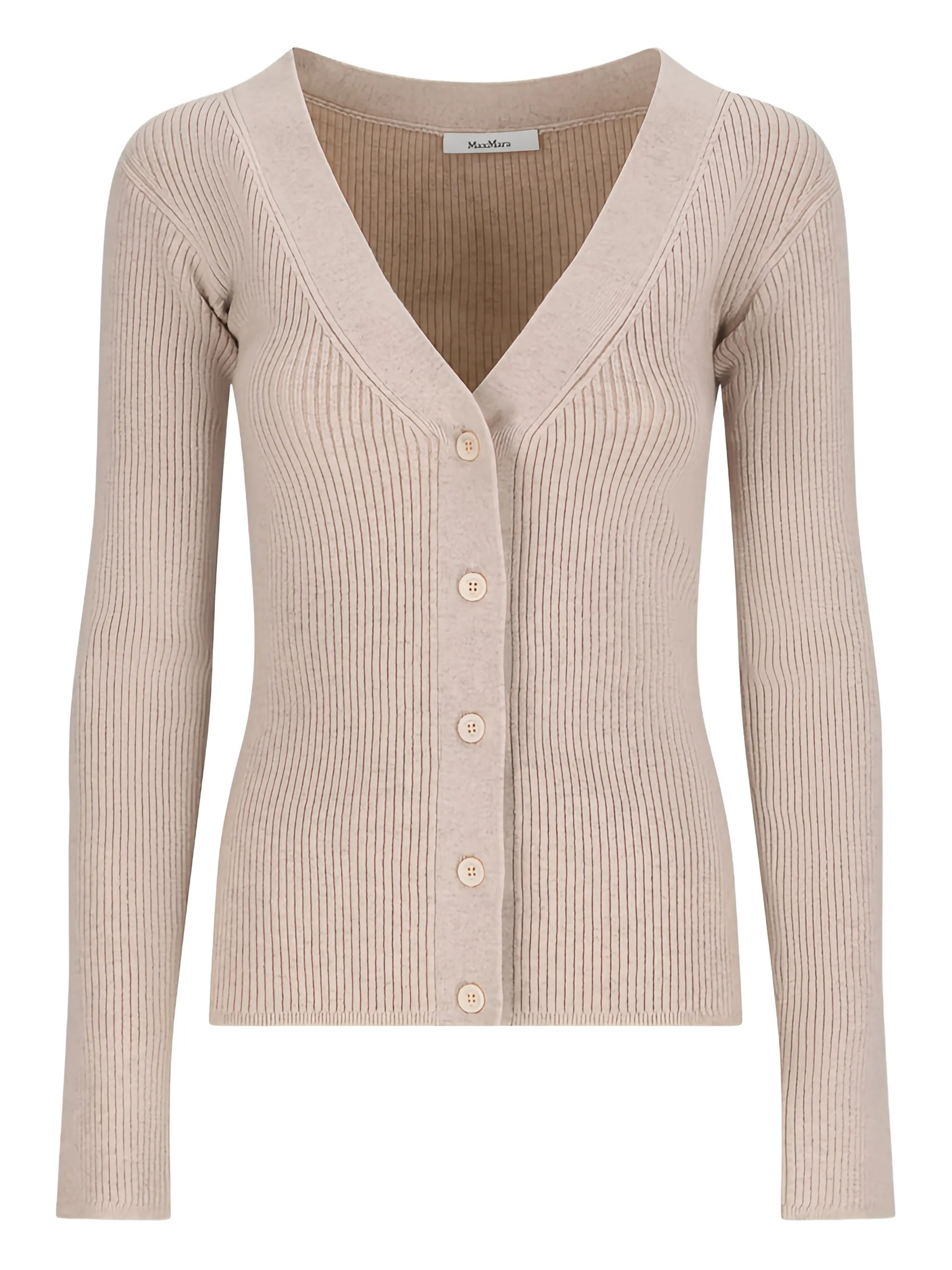 Elevate your everyday wardrobe with this luxurious Nude Neutrals Wool Cashmere Cardigan from Max Mara. Crafted from a premium wool-cashmere blend, this wide-rib knit cardigan features a flattering V-neckline and classic button-front closure.