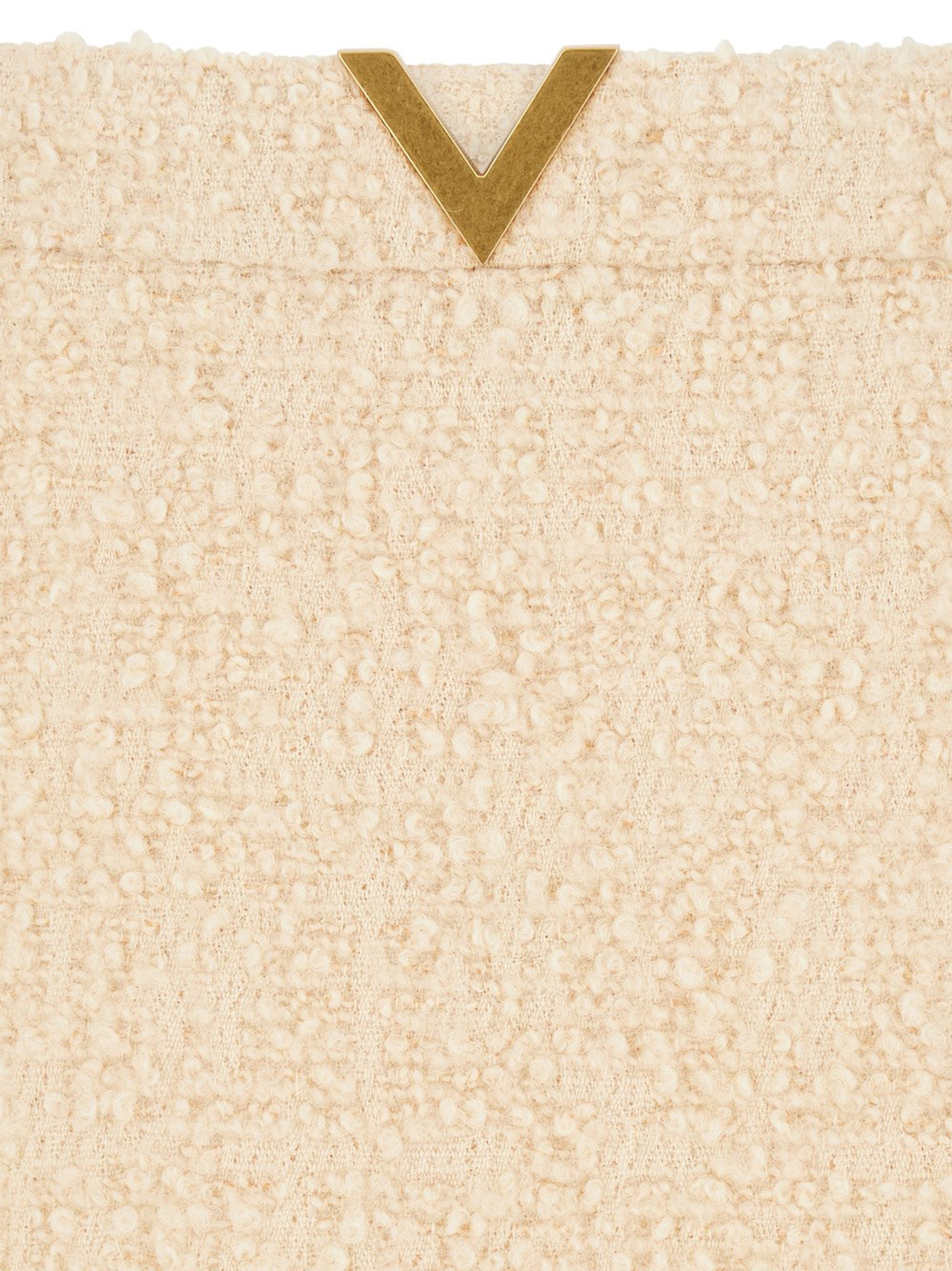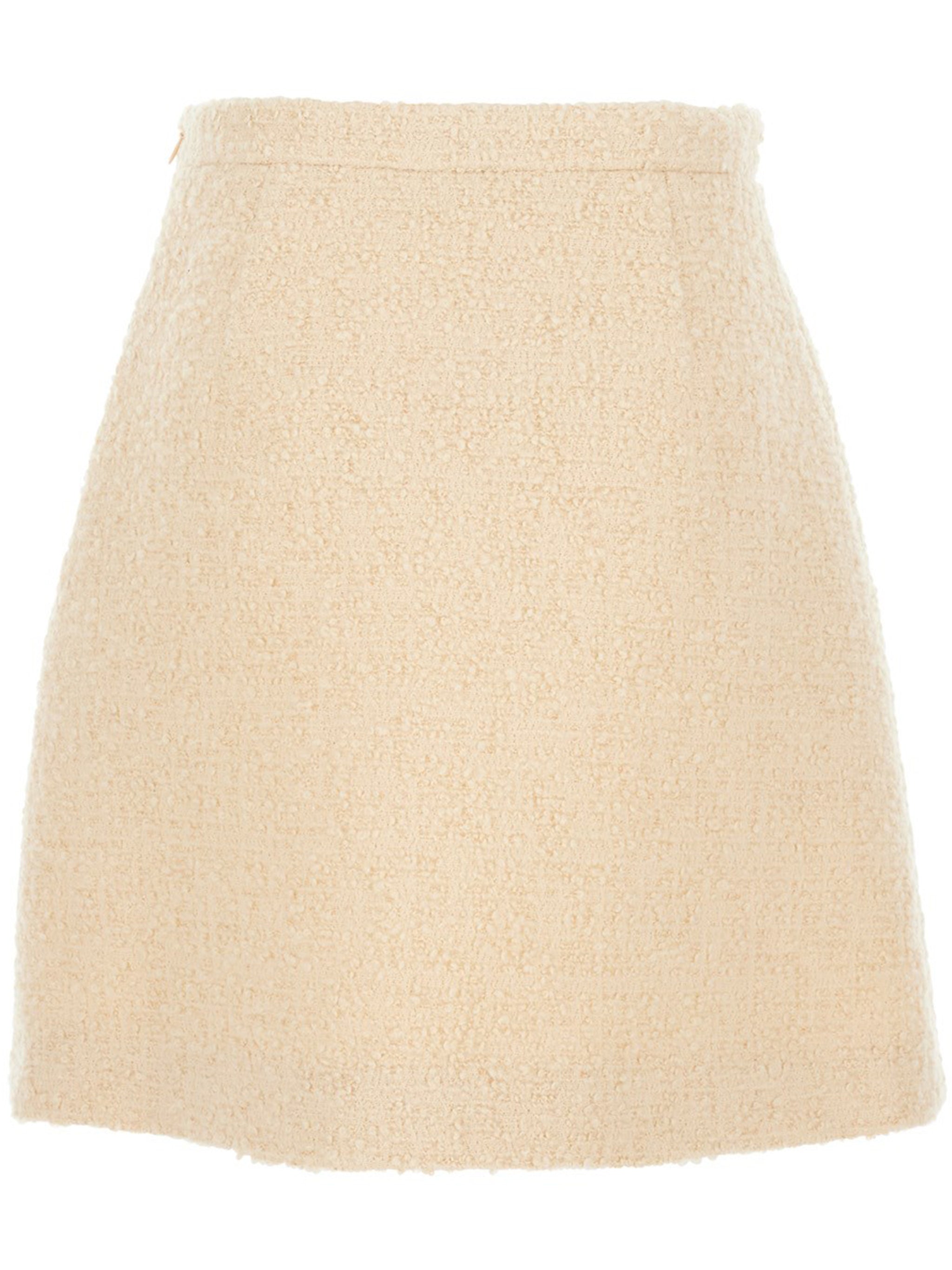 Crafted from premium wool, this mini skirt offers both comfort and elegance with its textured finish and signature V-detail at the waist. The versatile neutral colorway makes it effortlessly chic for any occasion.