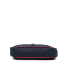 This shoulder bag features a nylon body, a flat shoulder strap, an open top with a flat leather strap pull-through closure, and an interior zip pocket.