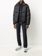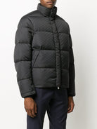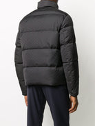 BLACK QUILTED MONOGRAM PRINT TWO FRONT WELT POCKETS HIGH NECK LONG SLEEVES CONCEALED FRONT FASTENING