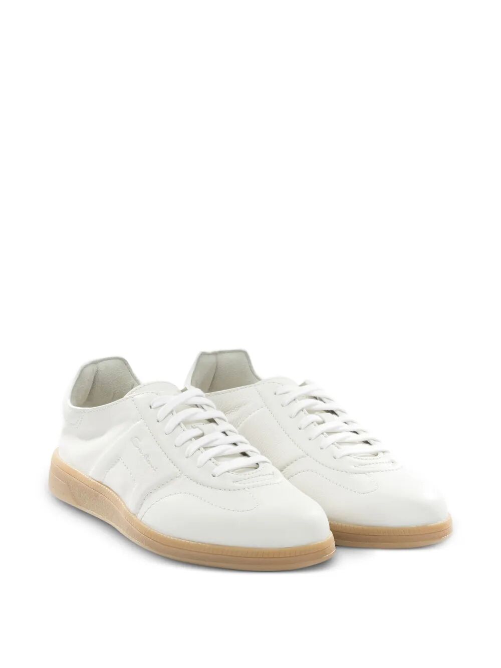 The clean, minimalist silhouette features a classic lace-up design and a distinctive gum sole that adds a touch of casual refinement. Perfect for weekend outings, smart-casual office environments, or elevated off-duty looks, these versatile sneakers seamlessly bridge the gap between luxury and everyday wearability.