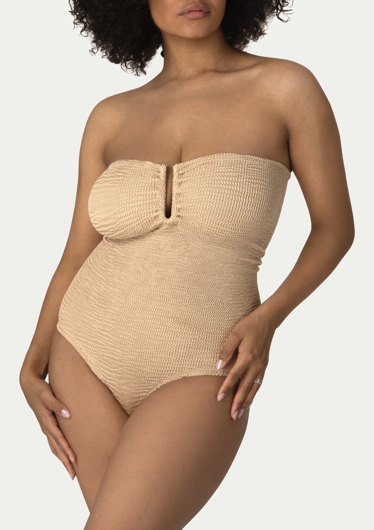One piece swimsuit FRIDA SUGAR is made from super elastic fabric which fits through sizes XS to 2XL. The design is strapless featuring a frontal U-Bar hook at the front. To maintain the swimsuit’s high elasticity and bright color, please hand wash it with soap and warm water. Do not tumble-dry, only air-dry.