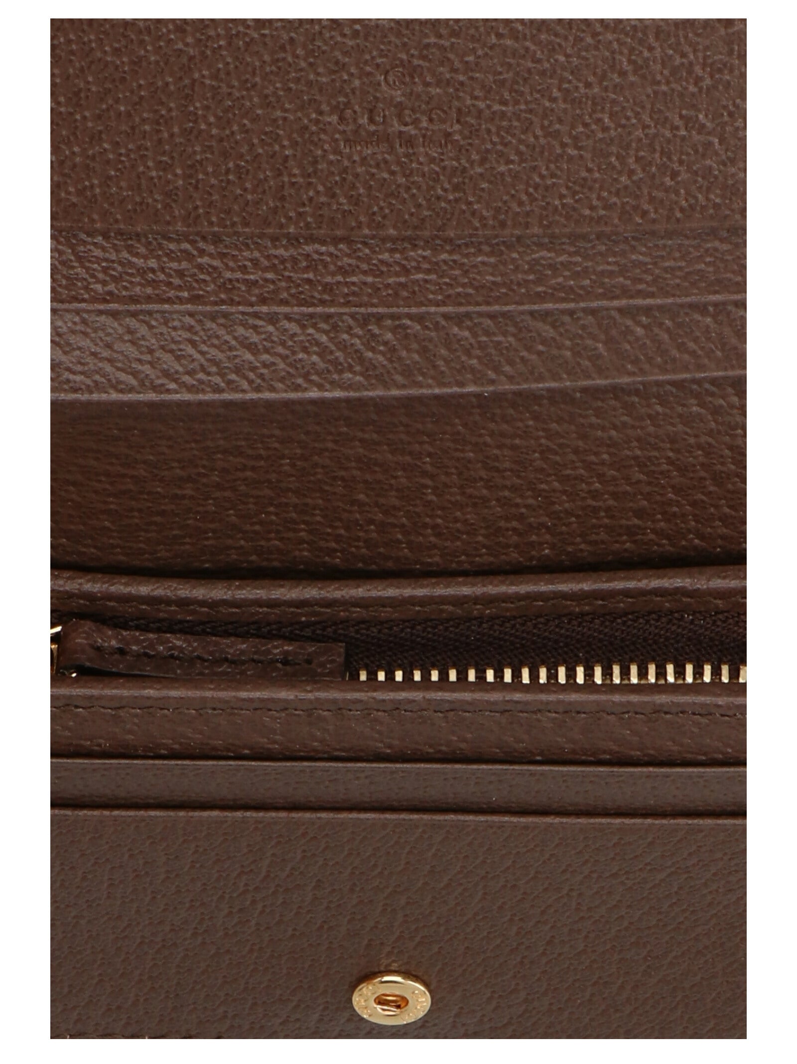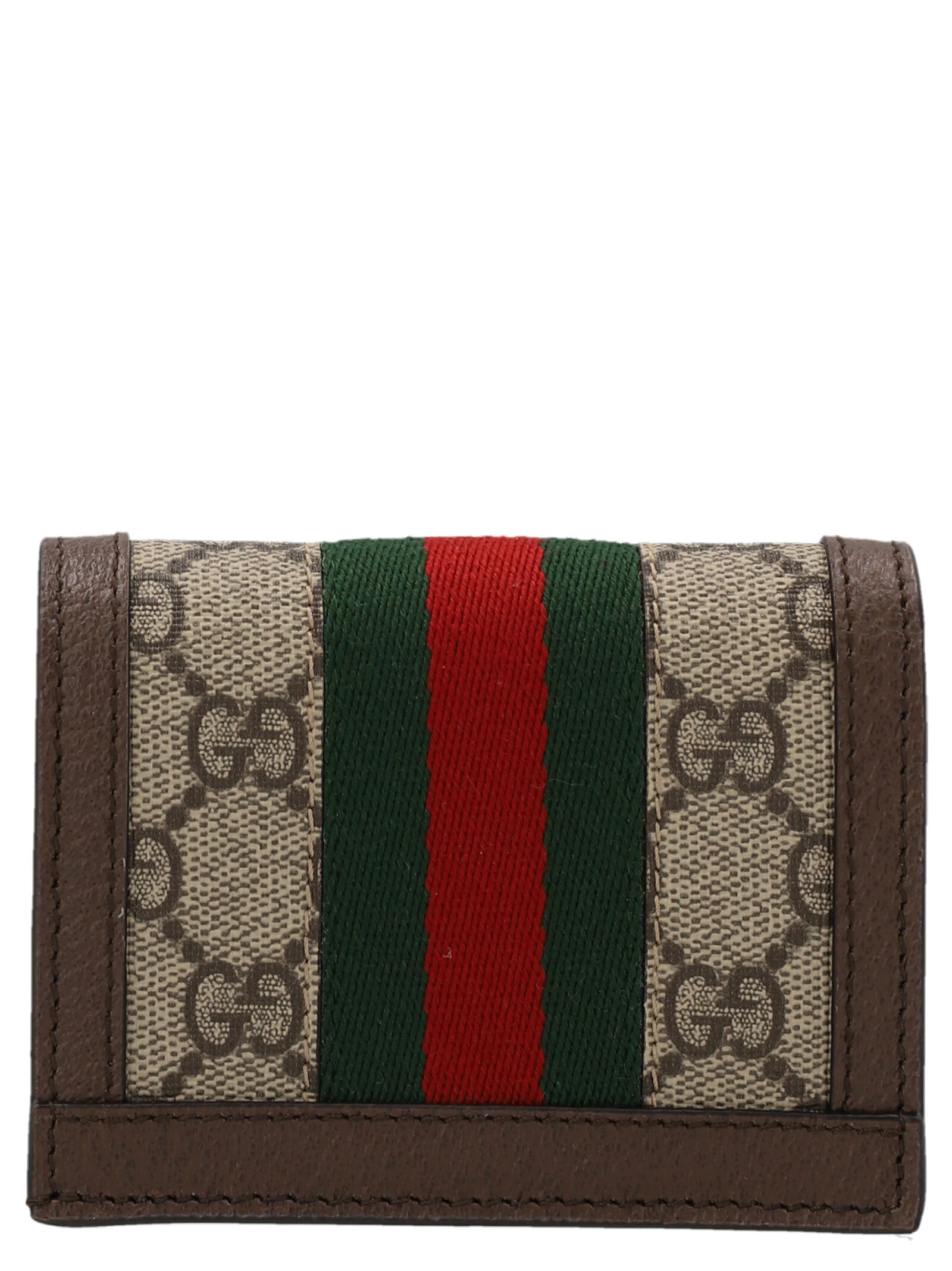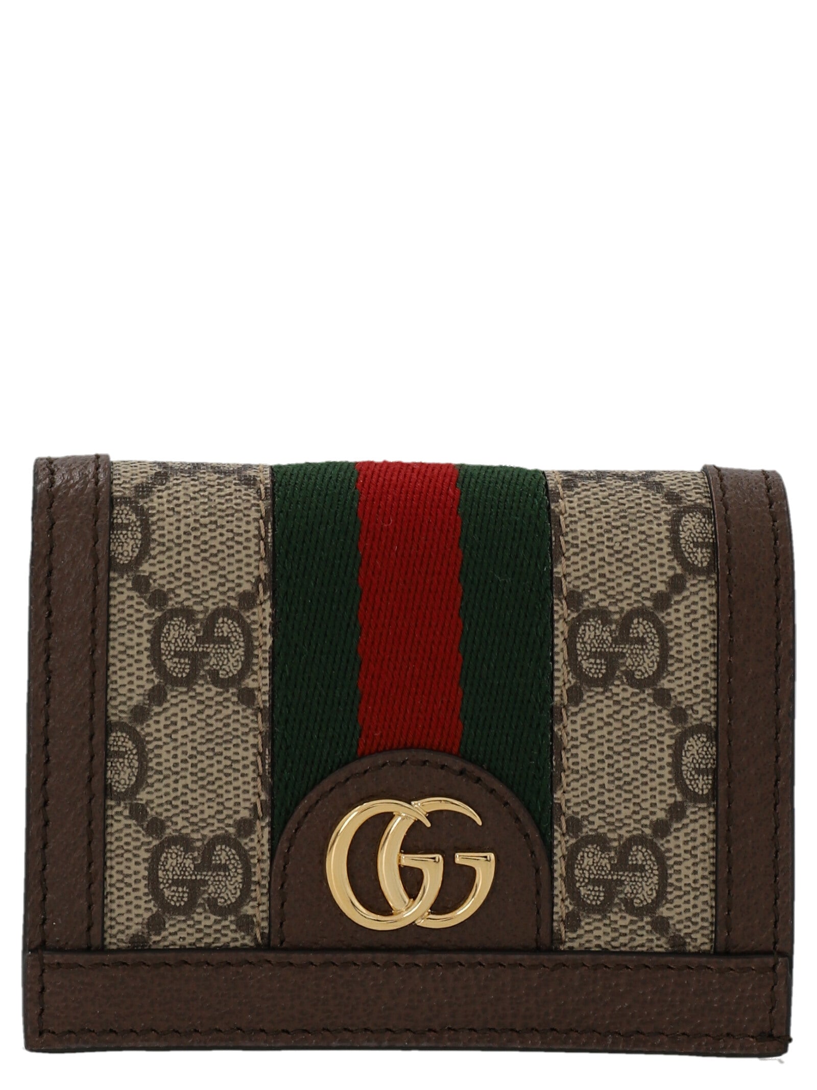 'Ophidia' wallet in beige and ebony GG Supreme fabric, a material with a reduced environmental impact, featuring brown leather trimming, antiqued gold hardware, green and red web, a double G, five card slots, a compartment for banknotes, an inner zipped pocket, and a snap button closure. Introduced for the first time in the 1970s, the GG pattern evolves from the original Gucci diamond motif of the 1930s and is now a hallmark of the Maison.