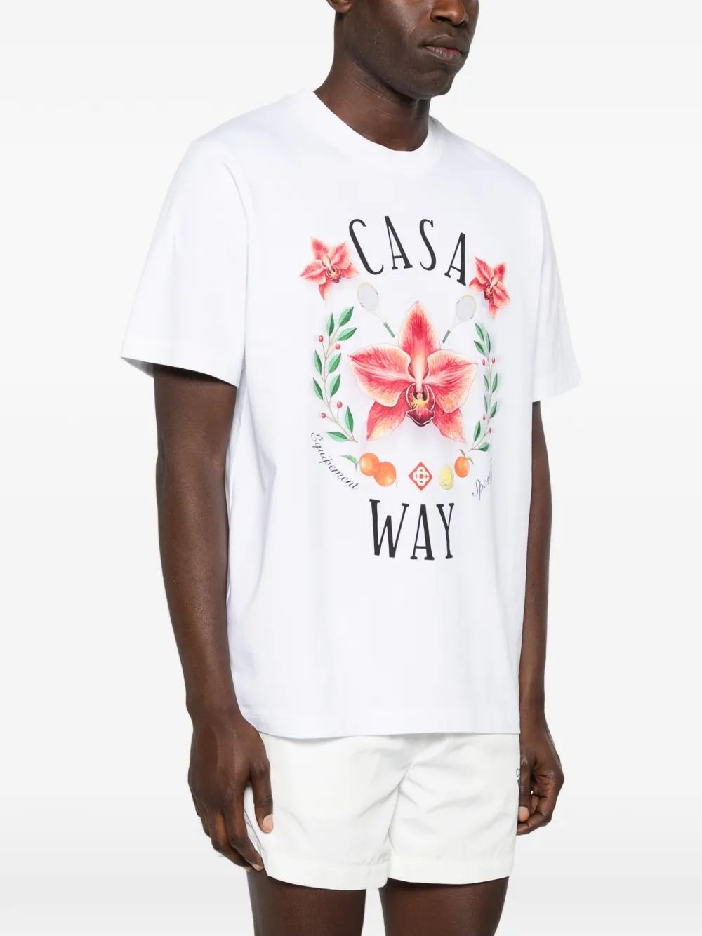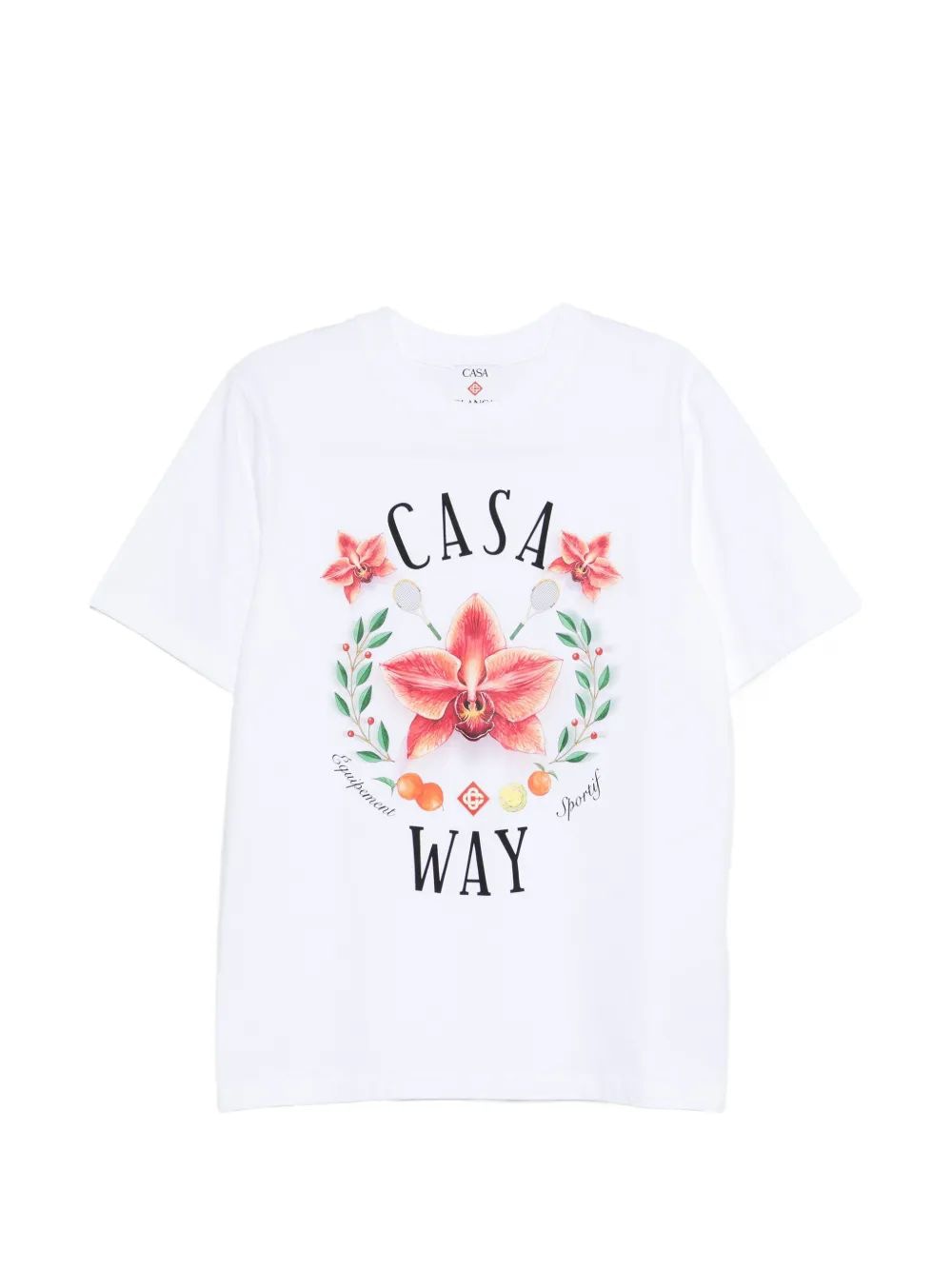 Elevate your casual wardrobe with the Orchid T-Shirt from Casablanca. This luxurious white tee features a stunning hand-drawn floral graphic with vibrant orchid blooms and the signature "Casa Way" text, embodying the brand's signature vacation-inspired aesthetic.