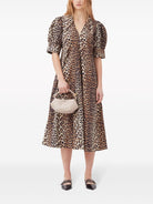 BROWN ORGANIC COTTON ALL-OVER LEOPARD PRINT SPREAD COLLAR V-NECK SHORT PUFF SLEEVES BELOW-KNEE LENGTH THIS ITEM IS MADE FROM AT LEAST 50% ORGANIC MATERIALS. LEARN MORE ABOUT WHAT MAKES A PRODUCT CONSCIOUS ON OUR CONSCIOUS CRITERIA PAGE