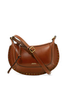 Isabel Marant small "Oskan Moon" shoulder bag, constructed of top-grain calfskin leather with a curved profile and compact silhouette. The structure features metallic stud detailing arranged in a series along the edges. Removable and adjustable shoulder strap with metal rings. Top closure with metal zipper. Interior divided into two main compartments with zippered center section. On the front, hot-stamped Isabel Marant logo.