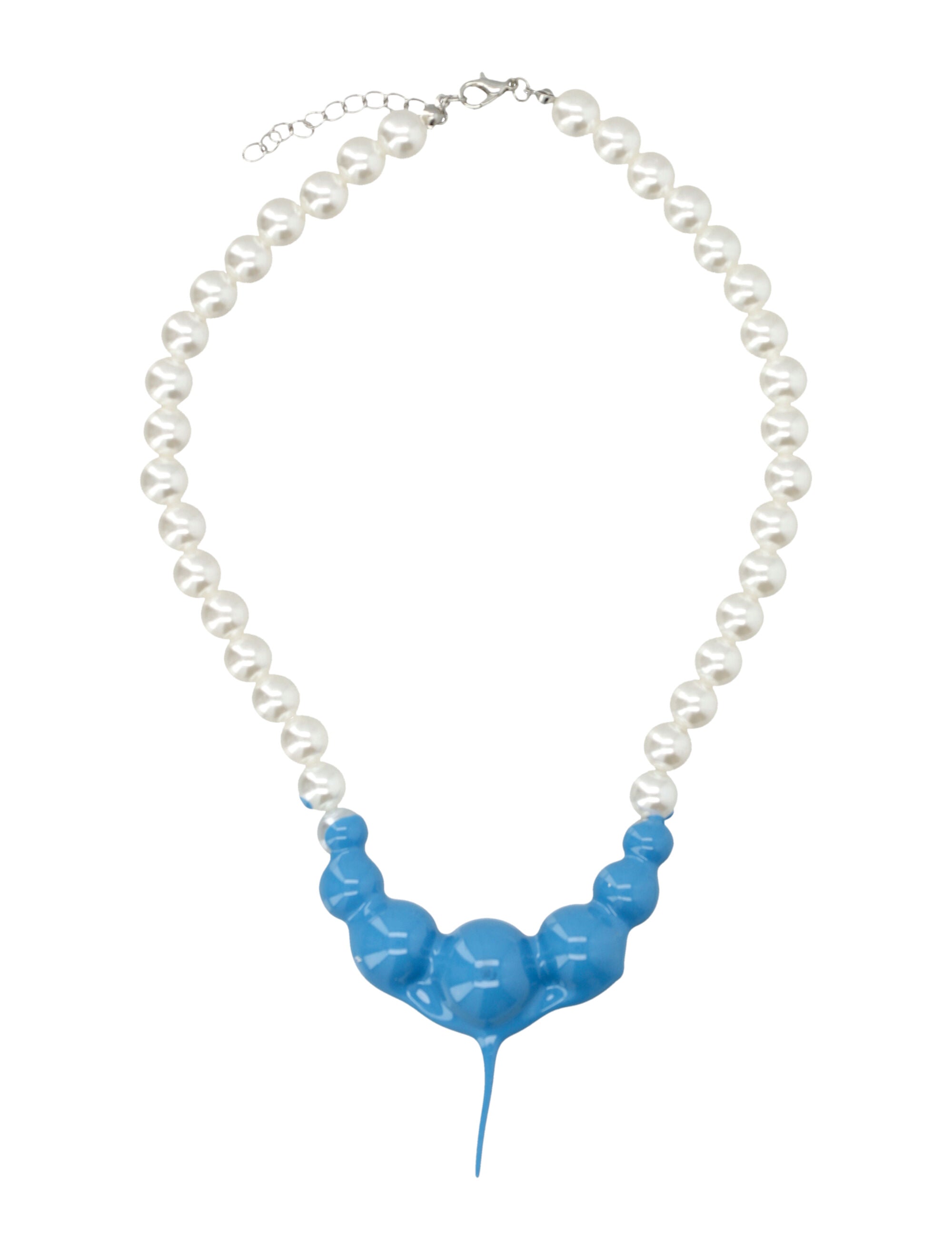 THIS NECKLACE PAIRS A STRAND OF GLOSSY FAUX PEARLS WITH A CENTRAL SEGMENT DIPPED IN BOLD BLUE RESIN, CREATING A MELTING EFFECT THAT MERGES FUTURISTIC EDGE WITH AVANT-GARDE ARTISTRY.