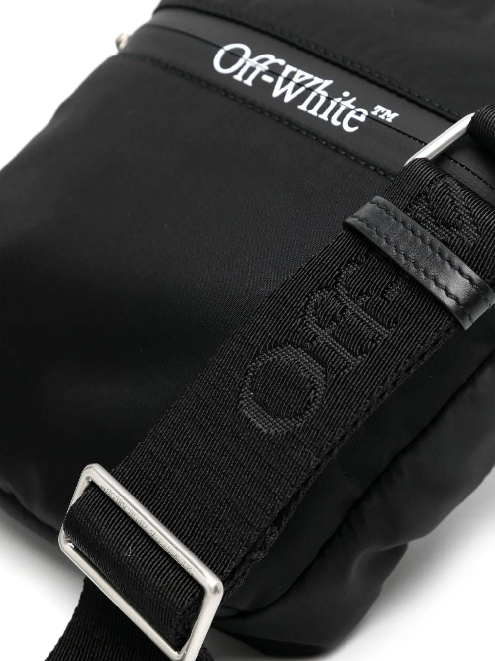 Introducing the Off-White Outdoor Crossbody, a sleek and functional accessory designed for the modern urbanite. This compact black bag features the signature Off-White branding on both the front and adjustable strap, adding a touch of luxury streetwear aesthetic to your everyday look.