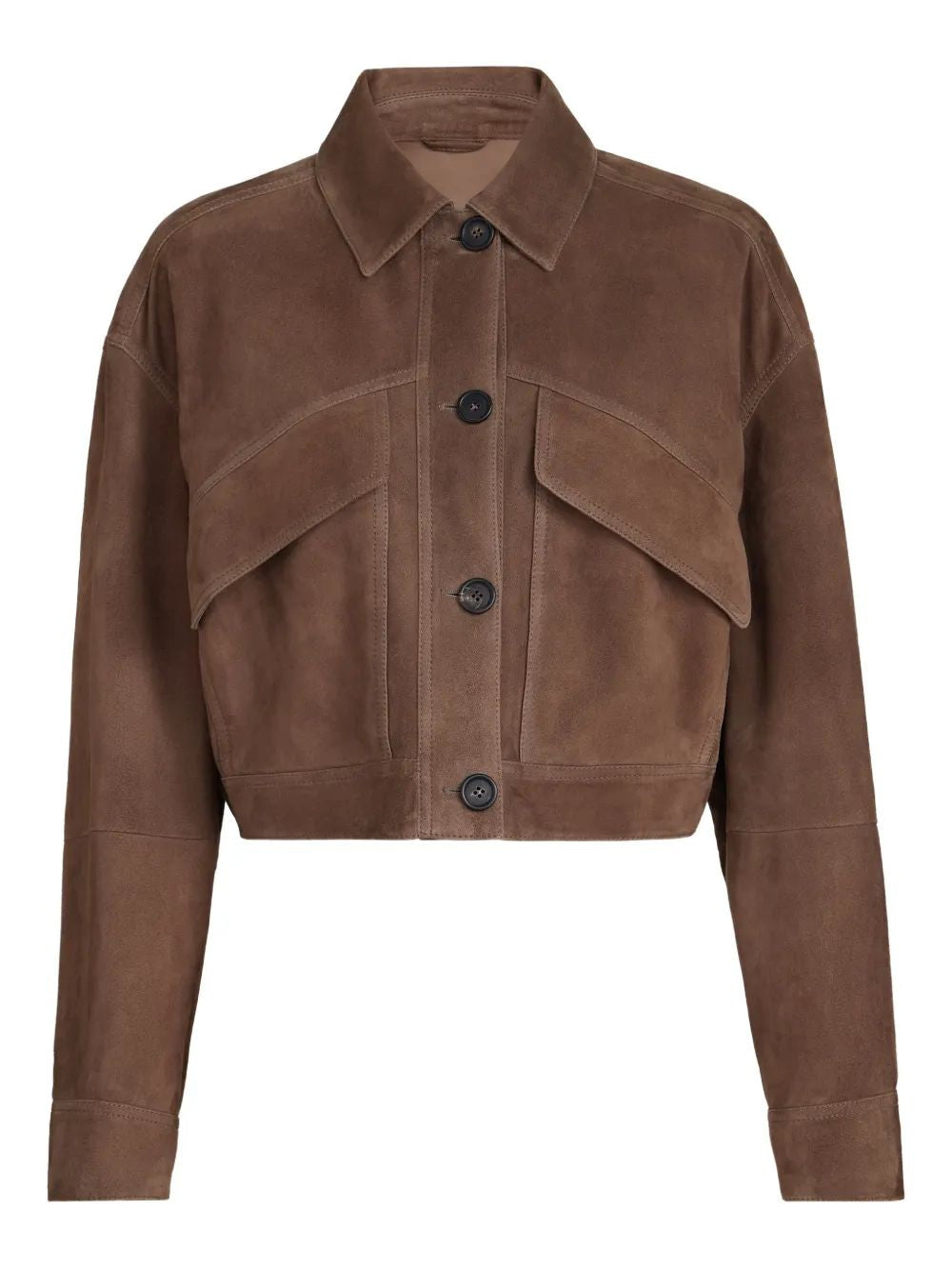 Elevate your outerwear collection with this exquisite cropped leather jacket from Brunello Cucinelli. Crafted from luxurious suede leather in a rich brown tone, this piece features a classic collared neckline and structured chest pockets that add utilitarian sophistication.