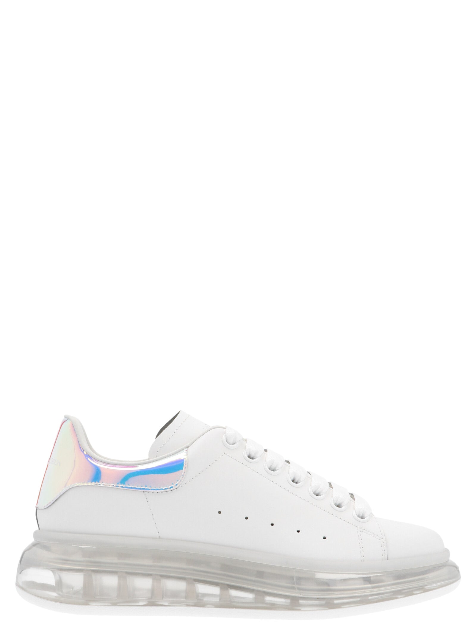 Elevate your sneaker game with these iconic 'Oversize sole' sneakers from McQueen. Crafted in premium white leather, these lace-up sneakers feature the brand's signature transparent oversized sole that adds a contemporary edge to any outfit.