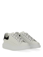 Elevate your sneaker game with these iconic Alexander McQueen oversized low-top trainers. Crafted from premium white leather with distinctive suede heel panels and patterned laces, these luxury sneakers embody the brand's signature bold aesthetic.