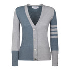 Elevate your wardrobe with this luxurious Thom Browne pale grey cashmere cardigan. This sophisticated piece features a classic V-neck silhouette with button-front closure, crafted from premium cashmere for ultimate comfort and style.