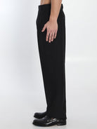 ELEGANT TROUSERS IN BLACK FABRIC, FEATURING A COMFORTABLE FIT AND A MODERN CUT. SIDE POCKETS AND BELT LOOPS AT THE WAIST.