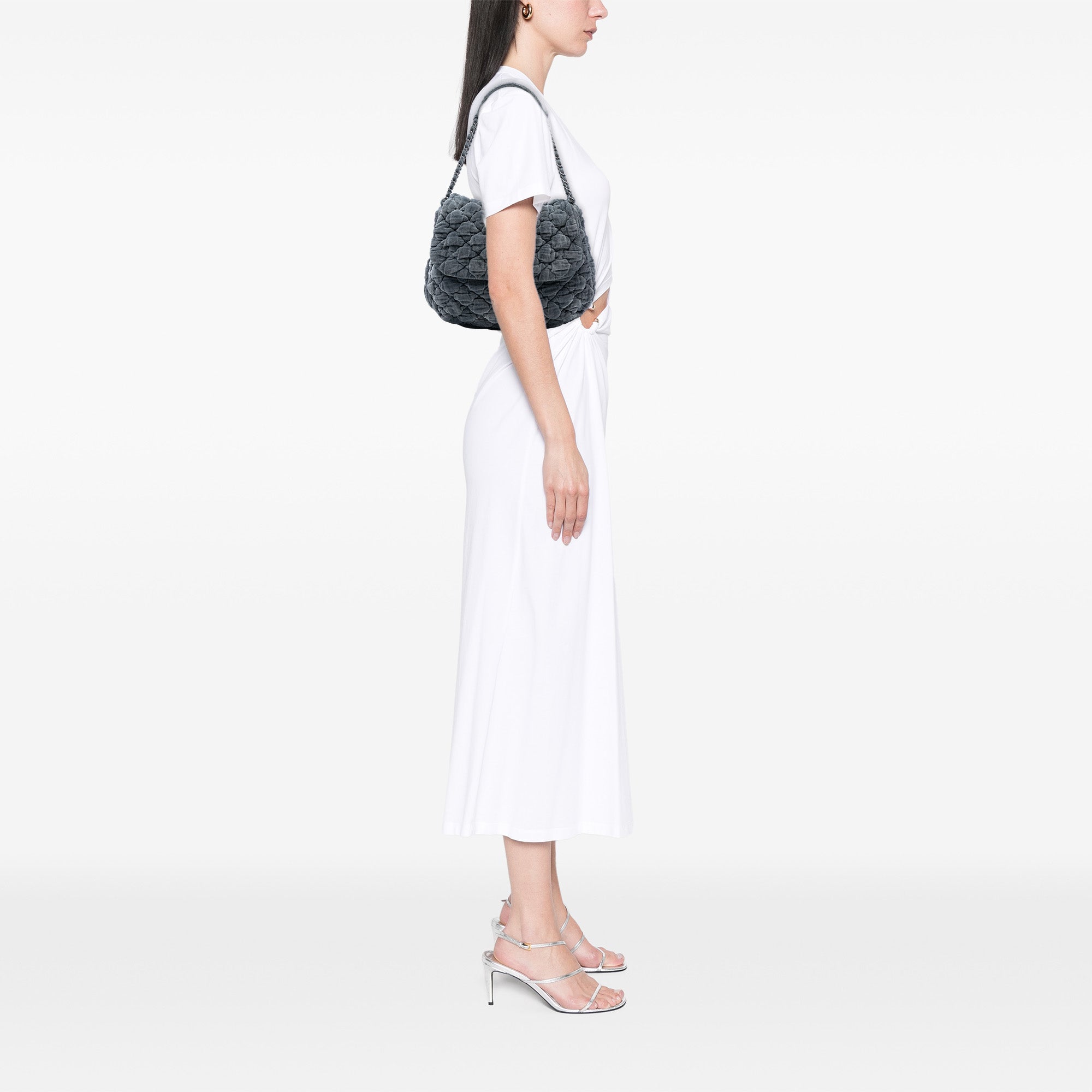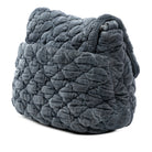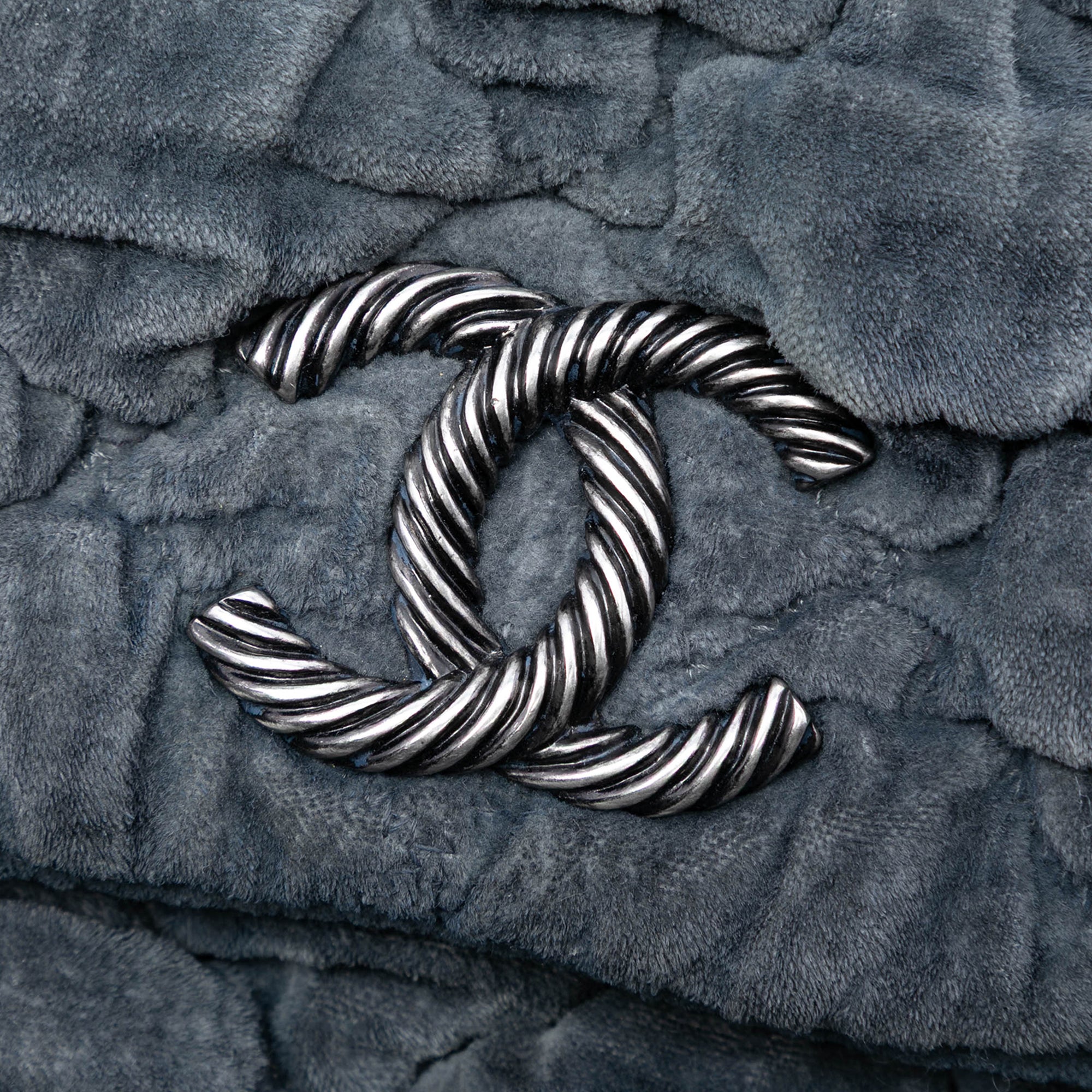 This shoulder bag features a quilted velvet body, a velvet woven chain link strap, a front flap with magnetic snap closure, and interior zip and slip pockets.