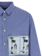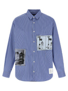 Elevate your wardrobe with this distinctive patch striped shirt from COMME DES GARÇONS HOMME. Crafted from premium cotton poplin, this long-sleeve button-up features eye-catching front patches and embroidery that add artistic flair to the classic striped pattern.