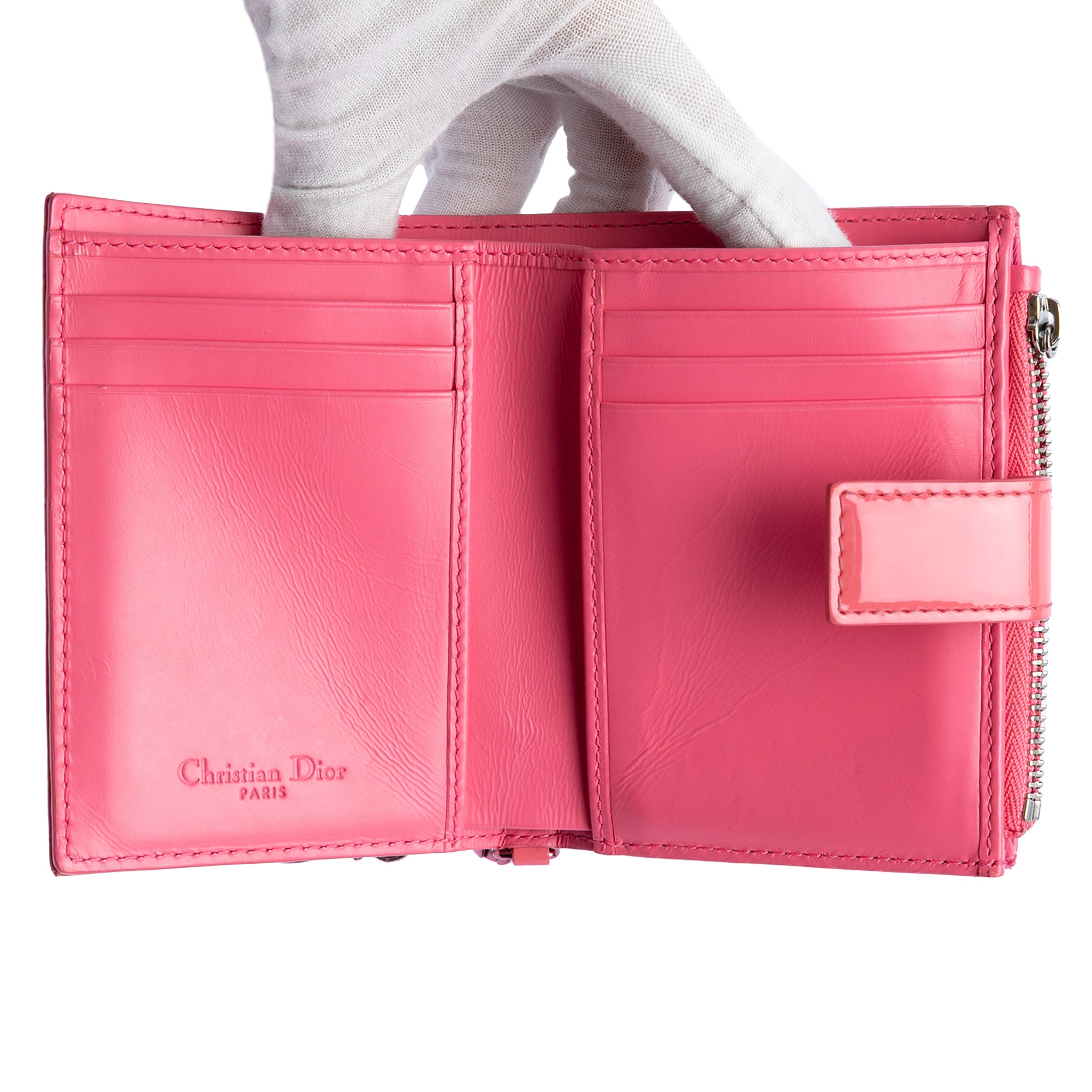 The practical design includes a top flap with snap closure, an exterior zip compartment for easy access, and multiple interior slip pockets to keep your cards and cash organized. The signature Dior charm adds an unmistakable touch of luxury.