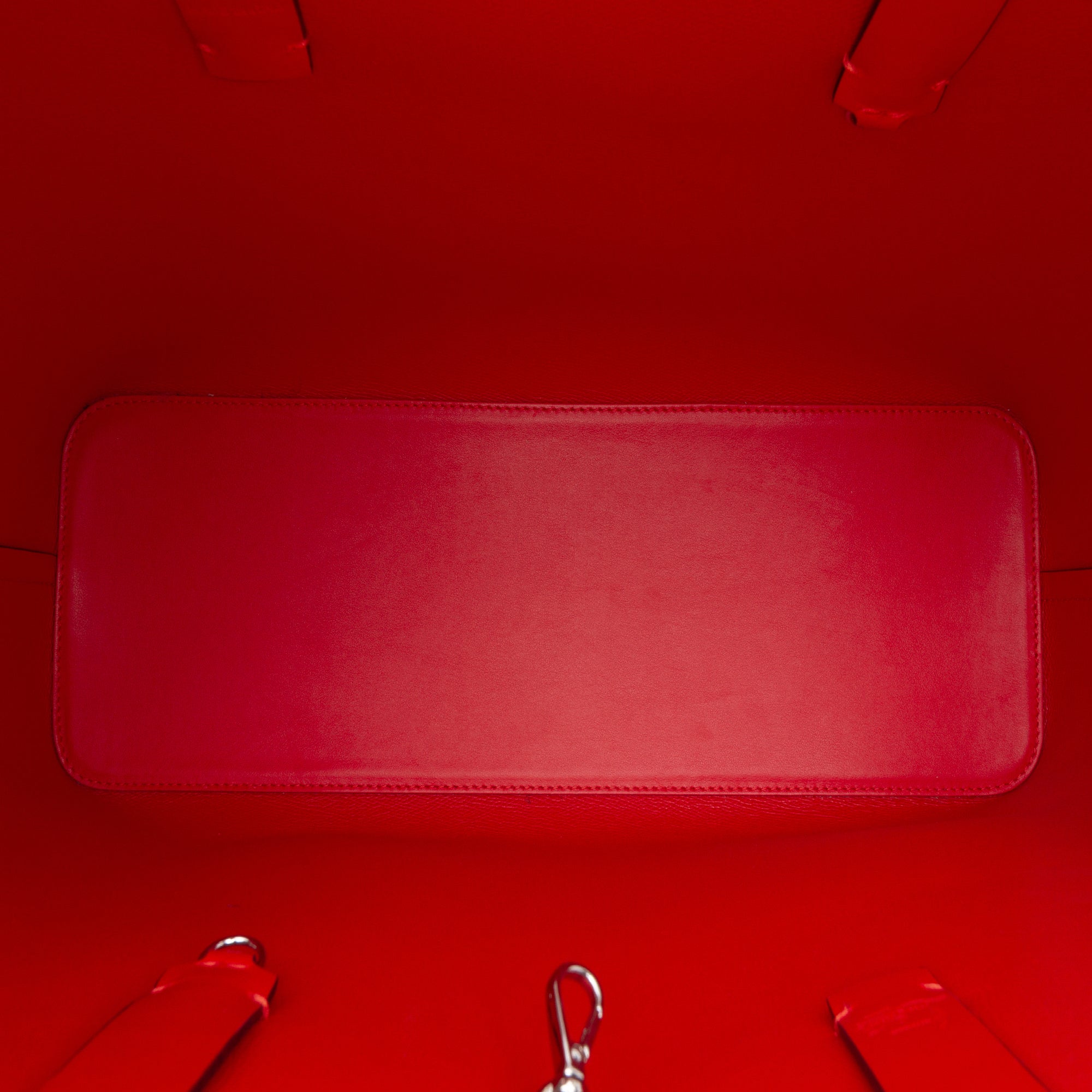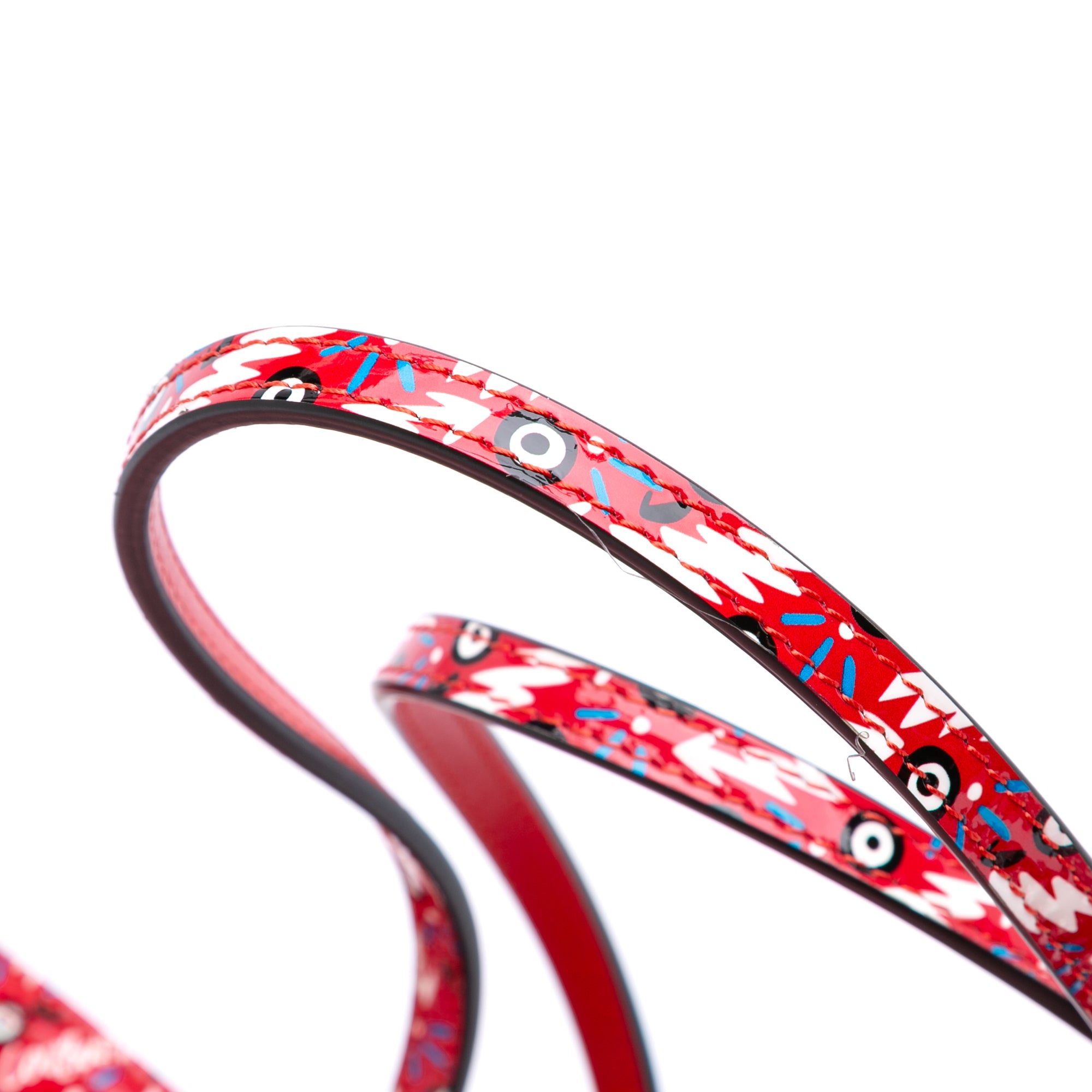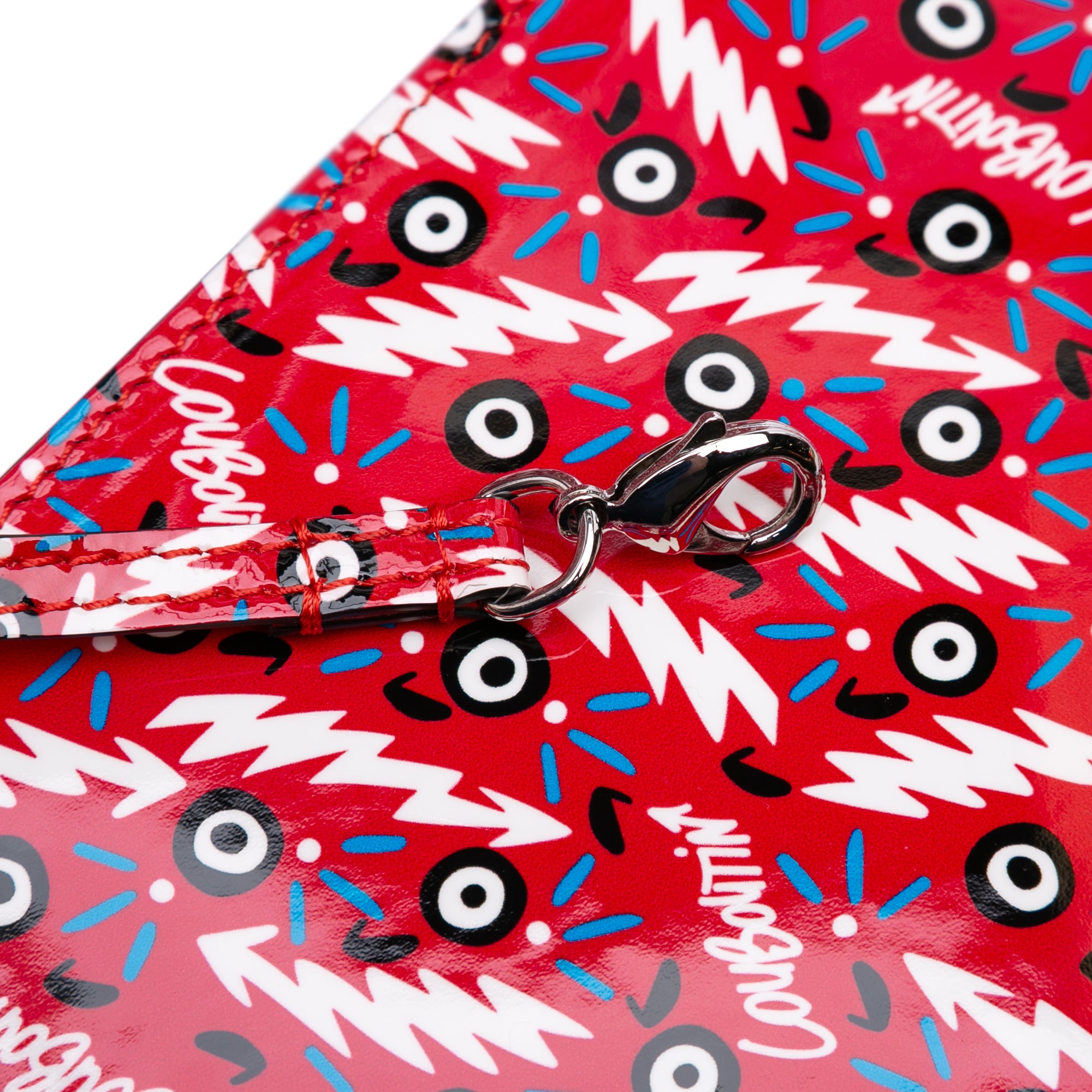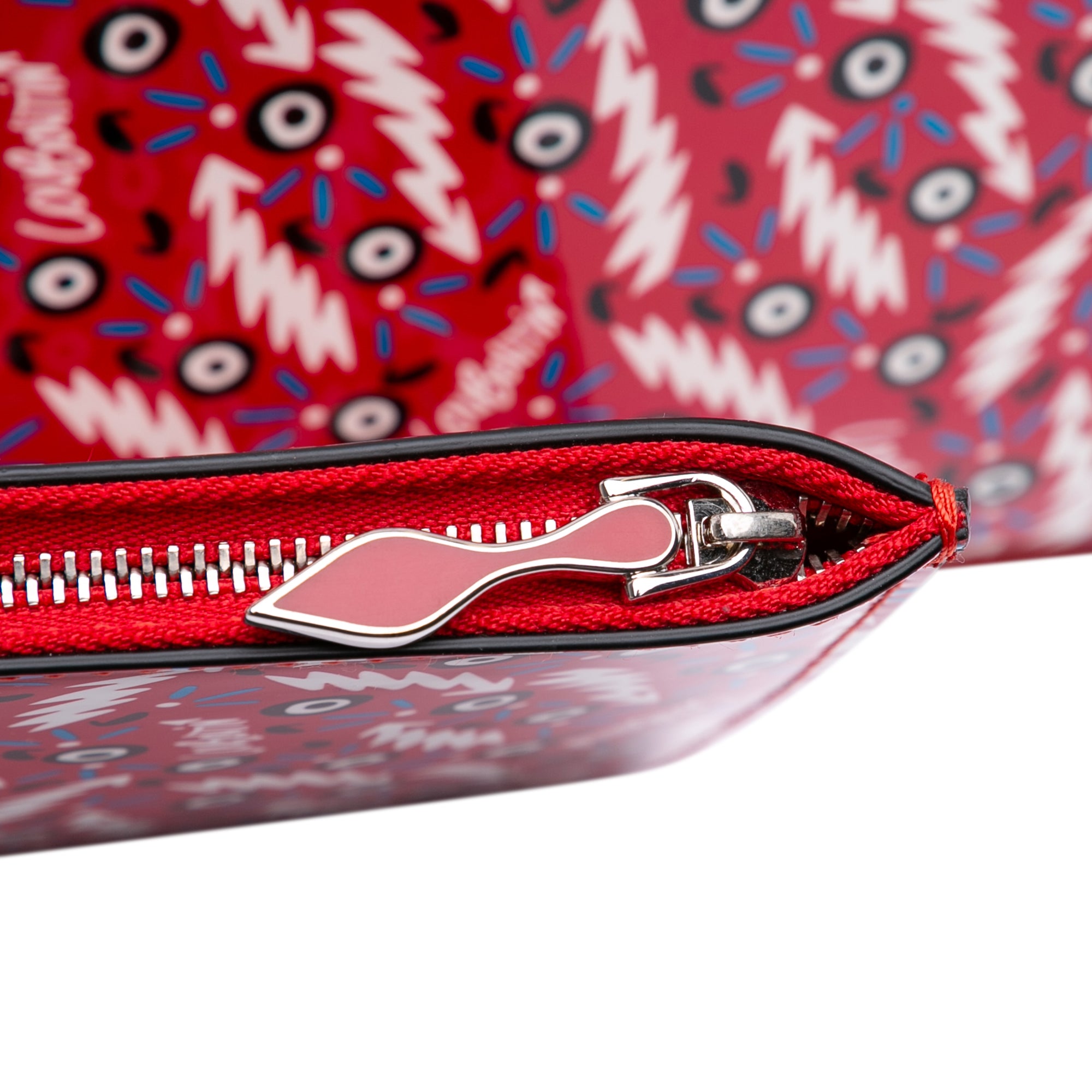 This tote bag features a printed leather body, flat leather shoulder straps, an open top with hook closure, and a zip pouch.