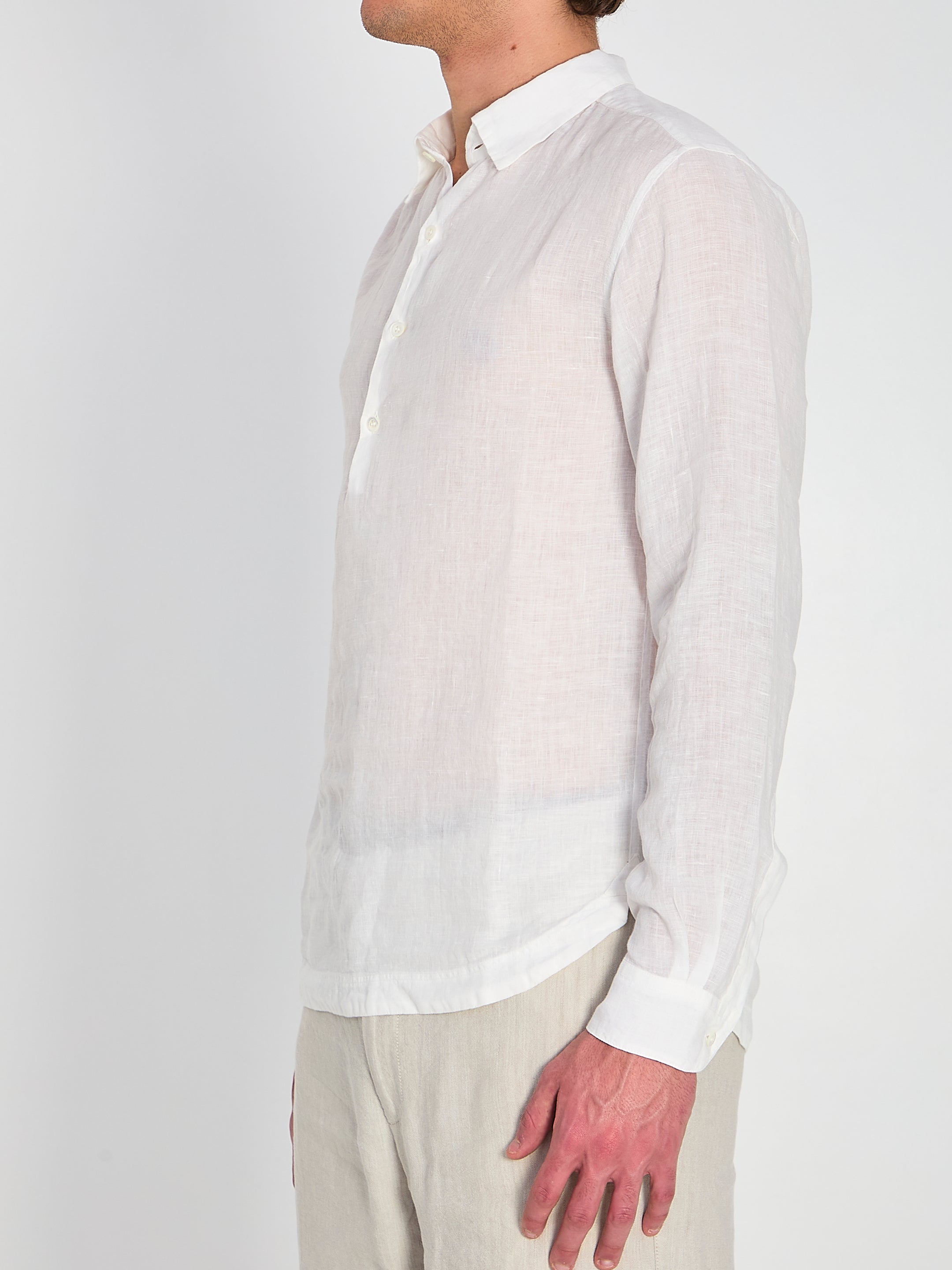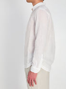 White linen shirt. Features a pointed collar, a mid-chest button closure, long sleeves, button cuffs, a rounded hem, longer at the back. Relaxed fit.