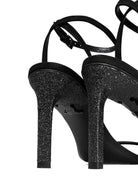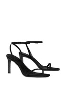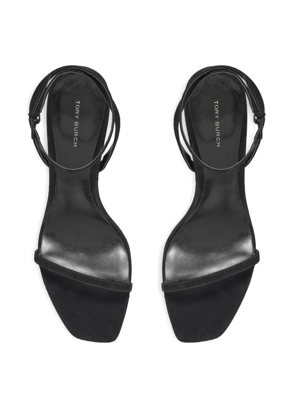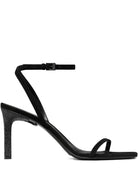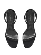 Crafted from luxurious suede with refined leather accents, this minimalist design showcases a delicate ankle strap and slim toe strap for a modern, streamlined silhouette. The versatile black colorway makes it effortlessly chic for any occasion.