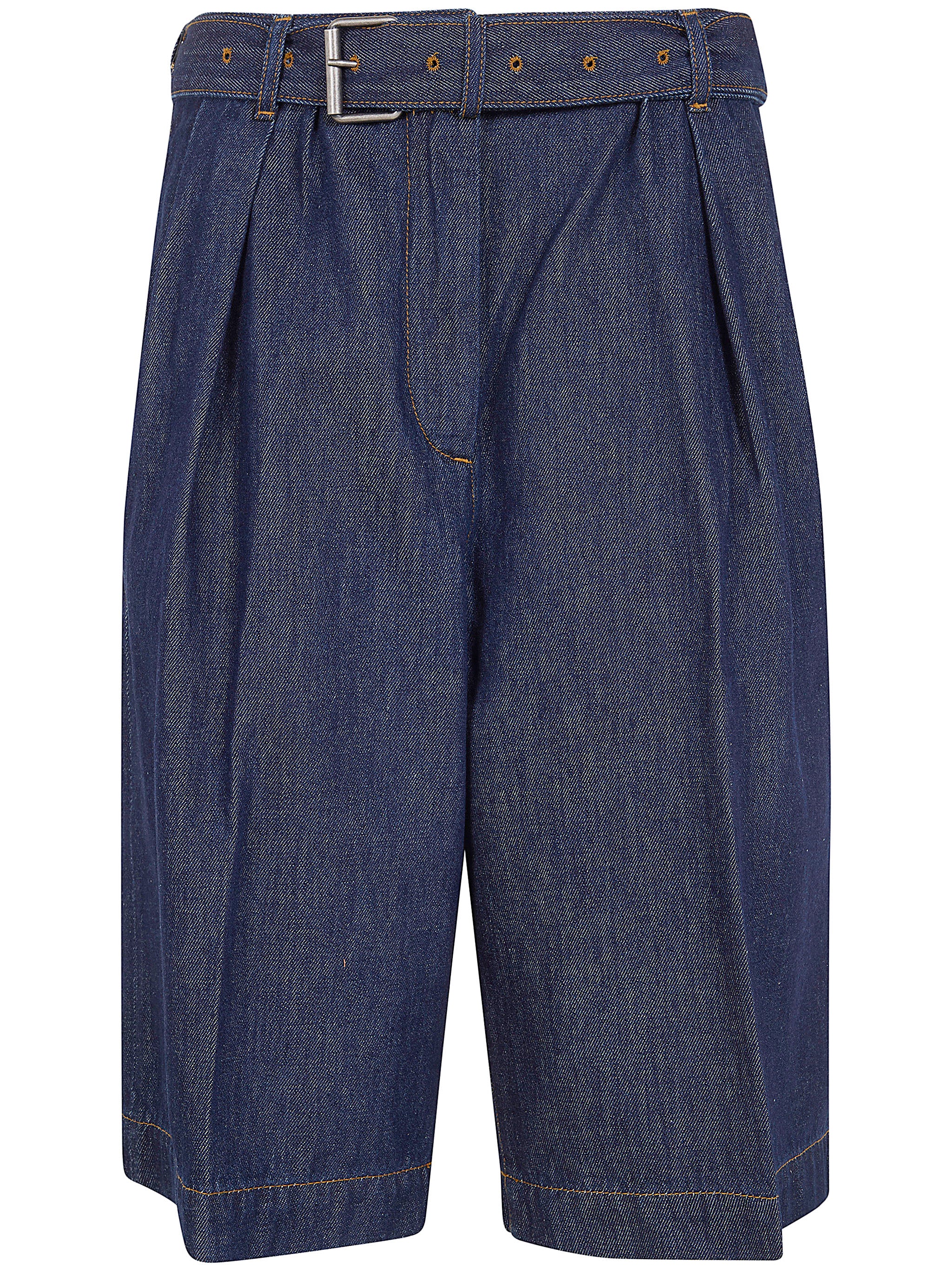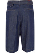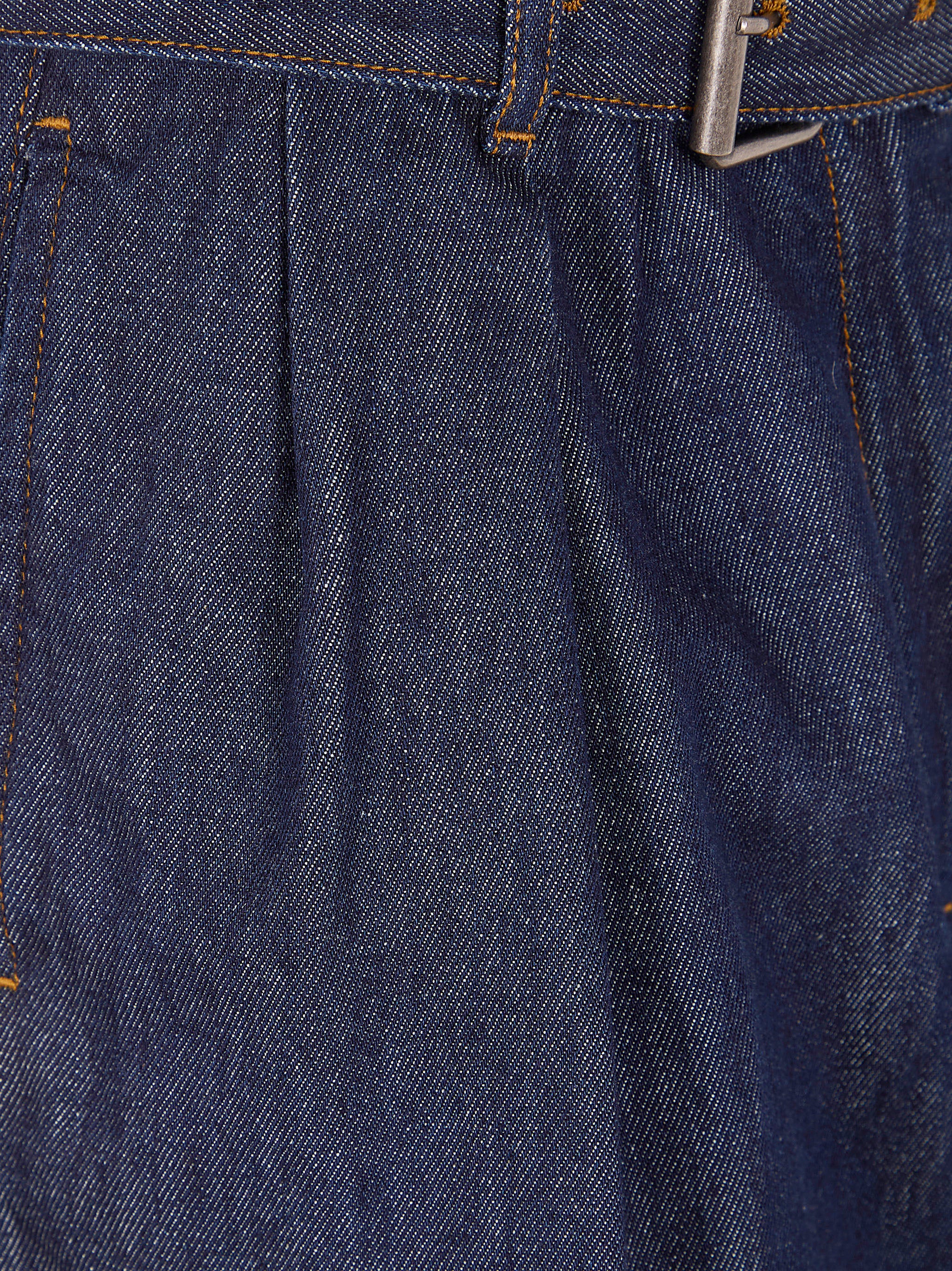 Introducing the "Peaches" Bis Shorts by Dries Van Noten, a sophisticated take on classic denim shorts. Crafted from 100% cotton denim in a rich indigo wash, these knee-length shorts feature elegant pleating at the front and a coordinating belted waist for a refined silhouette.