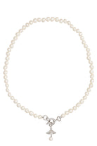 The Aleksa Pearl Necklace by Vivienne Westwood is an exquisite embodiment of timeless elegance and luxury. This stunning piece features hand-knotted glass pearls that create a delicate, sophisticated strand, completed with an eye-catching pendant adorned with sparkling crystals and a distinctive baroque pearl.
