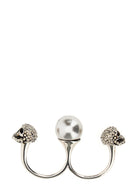Make a bold statement with this striking Pearl Skull Double Ring from Alexander McQueen. Crafted in luxurious silver metal, this unique piece features an innovative double-ring design that connects two bands with an architectural flair.