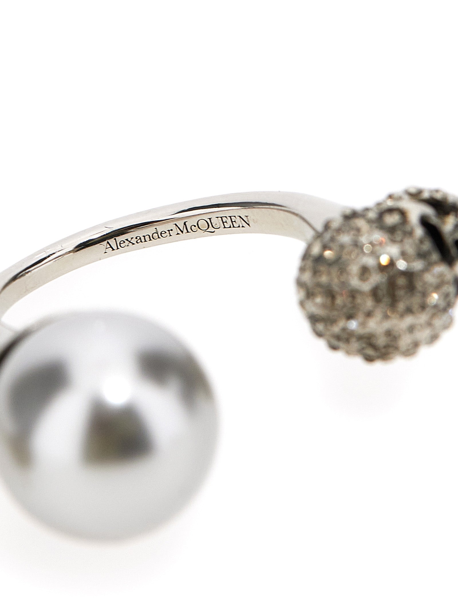 The ring showcases Alexander McQueen's signature edgy aesthetic with intricately detailed skull motifs embellished with sparkling crystals, balanced by an elegant central pearl that adds a touch of classic sophistication. This juxtaposition of dark romanticism and refined elegance creates a truly distinctive accessory.