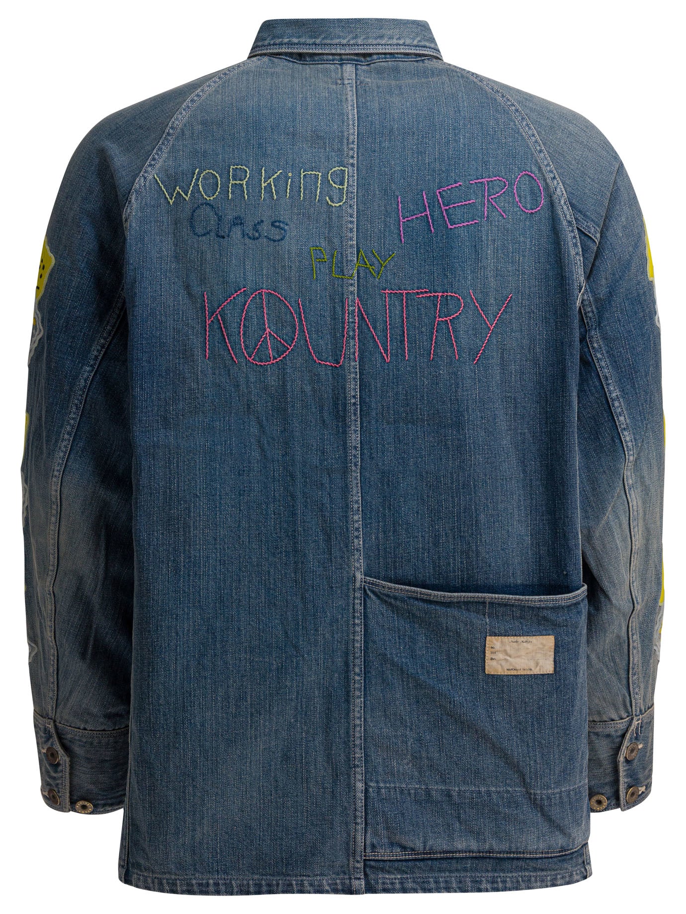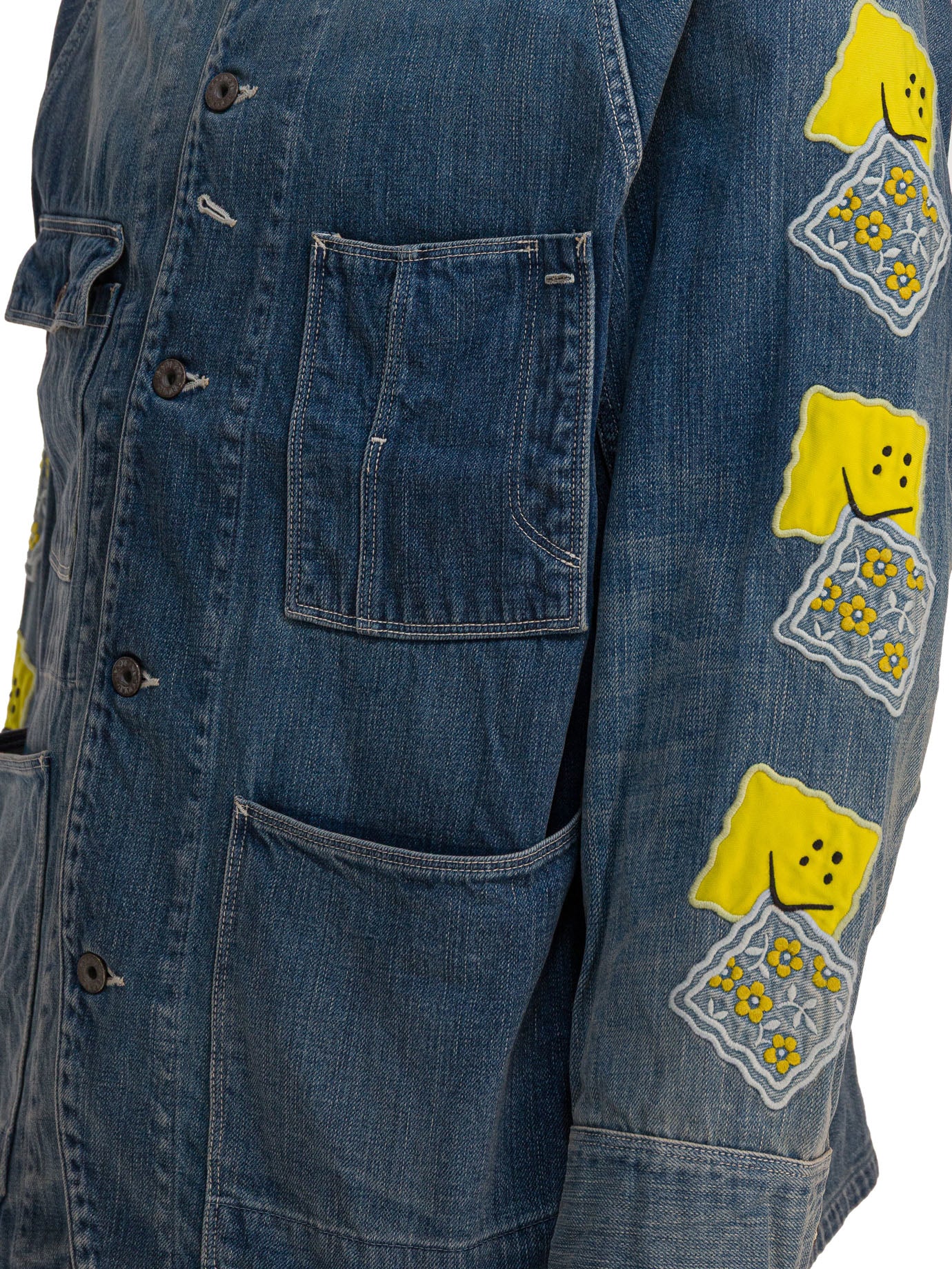 Kapital "Peckish Amifo Sleeve Model" jacket with regular-weave denim construction. The construction incorporates a classic collar and a front button closure. The design features visible double stitching throughout the garment. Two patch pockets on the chest and two patch pockets on the lower front. The back shows marked embroidery and the sleeves are made with patches and embroidered details.