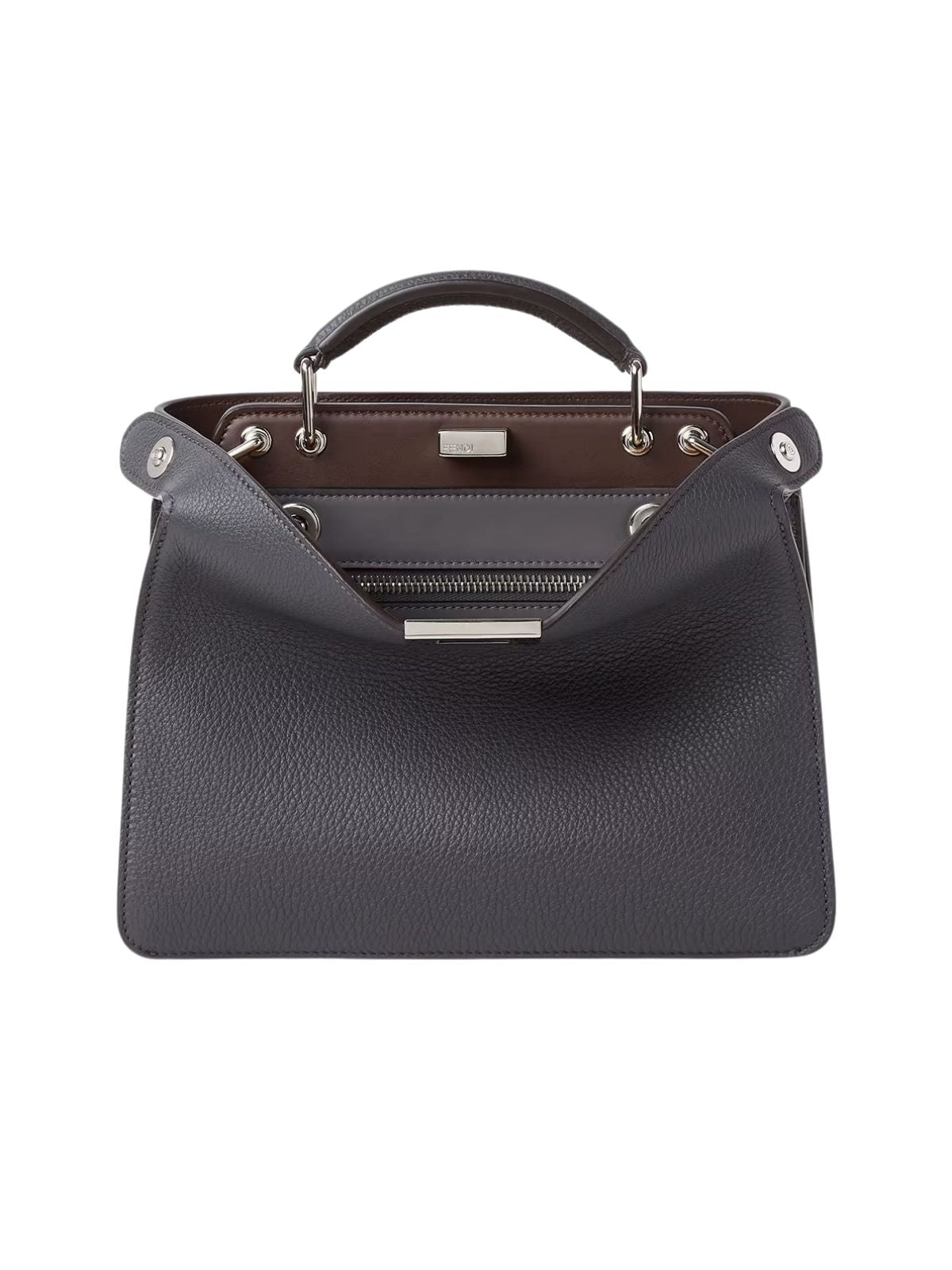 This structured satchel features the signature peekaboo design with a sophisticated two-tone interior, elegant top handle, and versatile shoulder strap for multiple carrying options. The impeccable construction and timeless silhouette make it the perfect companion for the office, evening events, or sophisticated outings.