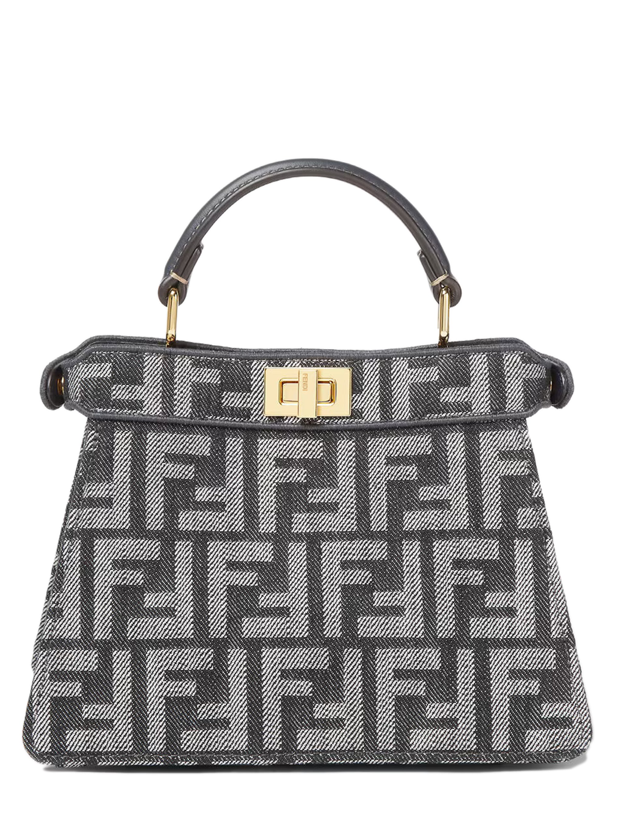 Introducing the Fendi Peekaboo ISeeU Petite, an iconic masterpiece that embodies timeless Italian luxury and sophisticated craftsmanship. This exquisitely compact handbag features the signature FF monogram pattern in a refined gray and black colorway, complemented by gleaming gold-finish hardware and the iconic twist lock closure on both sides.
