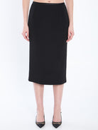 BLACK STRETCH WOOL DOUBLE CREPE PENCIL LONGUETTE SKIRT WITH DUCHESS SATIN EDGES. IT FEATURES A REGULAR WAIST, A BACK CLOSURE WITH A ZIPPER AND HOOK, AND A CENTER BACK SLIT.
