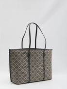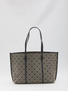 Cotton jacquard fabric bag with beige monogram and navy blue leather inserts. It features two fixed top handles, one main compartment, a removable zippered laptop sleeve for up to 13", one flat pocket, and one pocket with flap and button, metal feet, and cotton lining. Dustbag included. Any imperfections in the leather are not considered manufacturing defects, but a characteristic of the material.