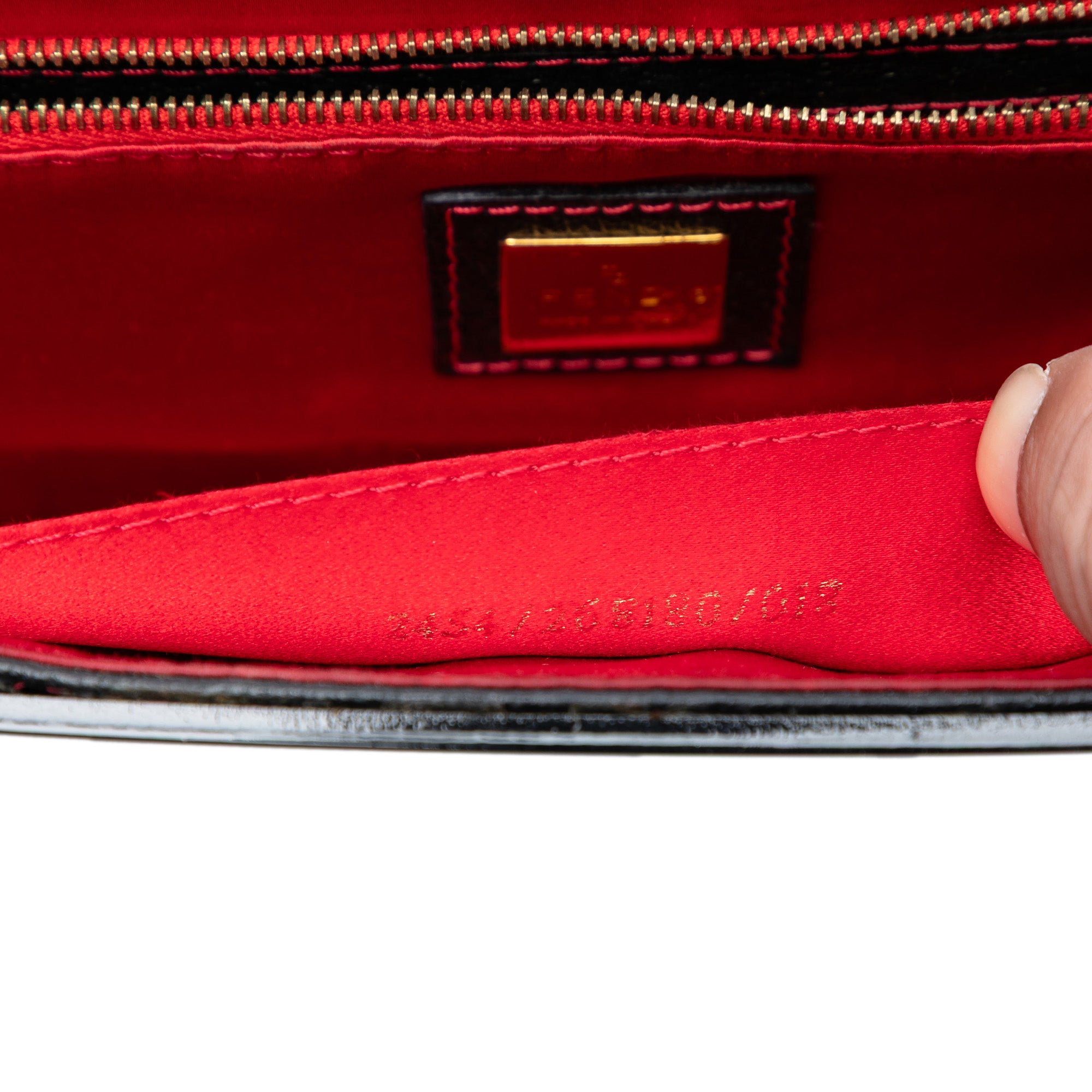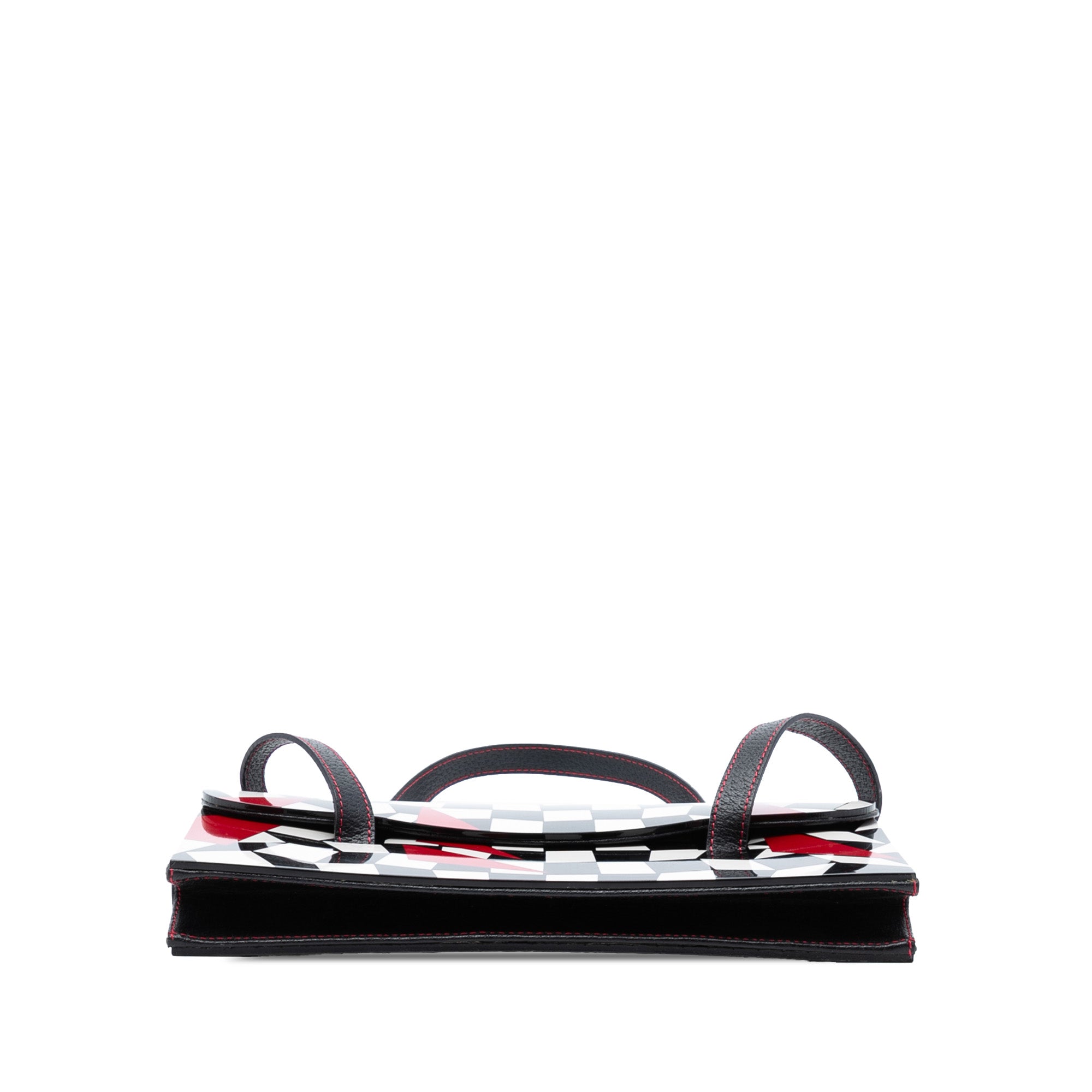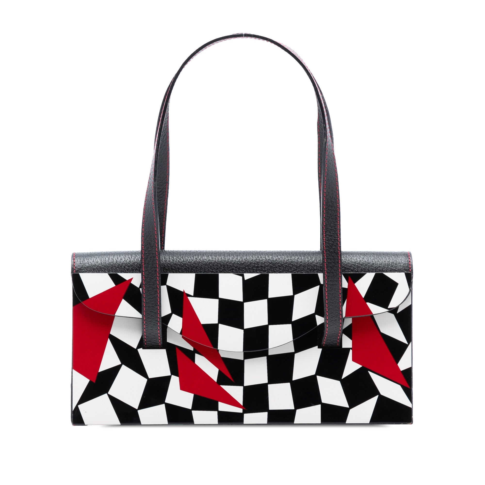 Make a bold statement with this striking Fendi Pigskin Plexiglass Geometric Shoulder Bag. Featuring a distinctive black and white checkered pattern accented with vibrant red geometric details, this eye-catching piece showcases Fendi's innovative design aesthetic.