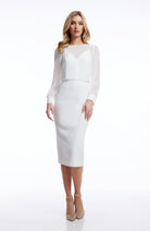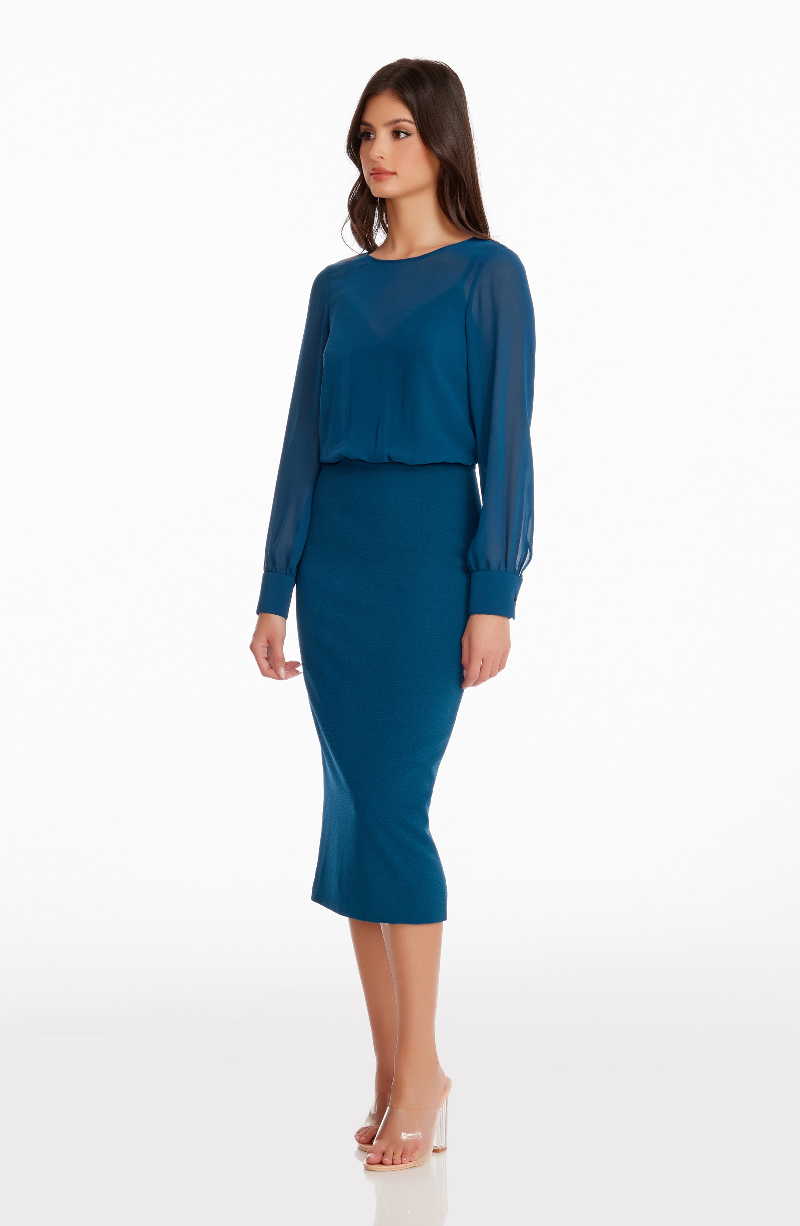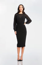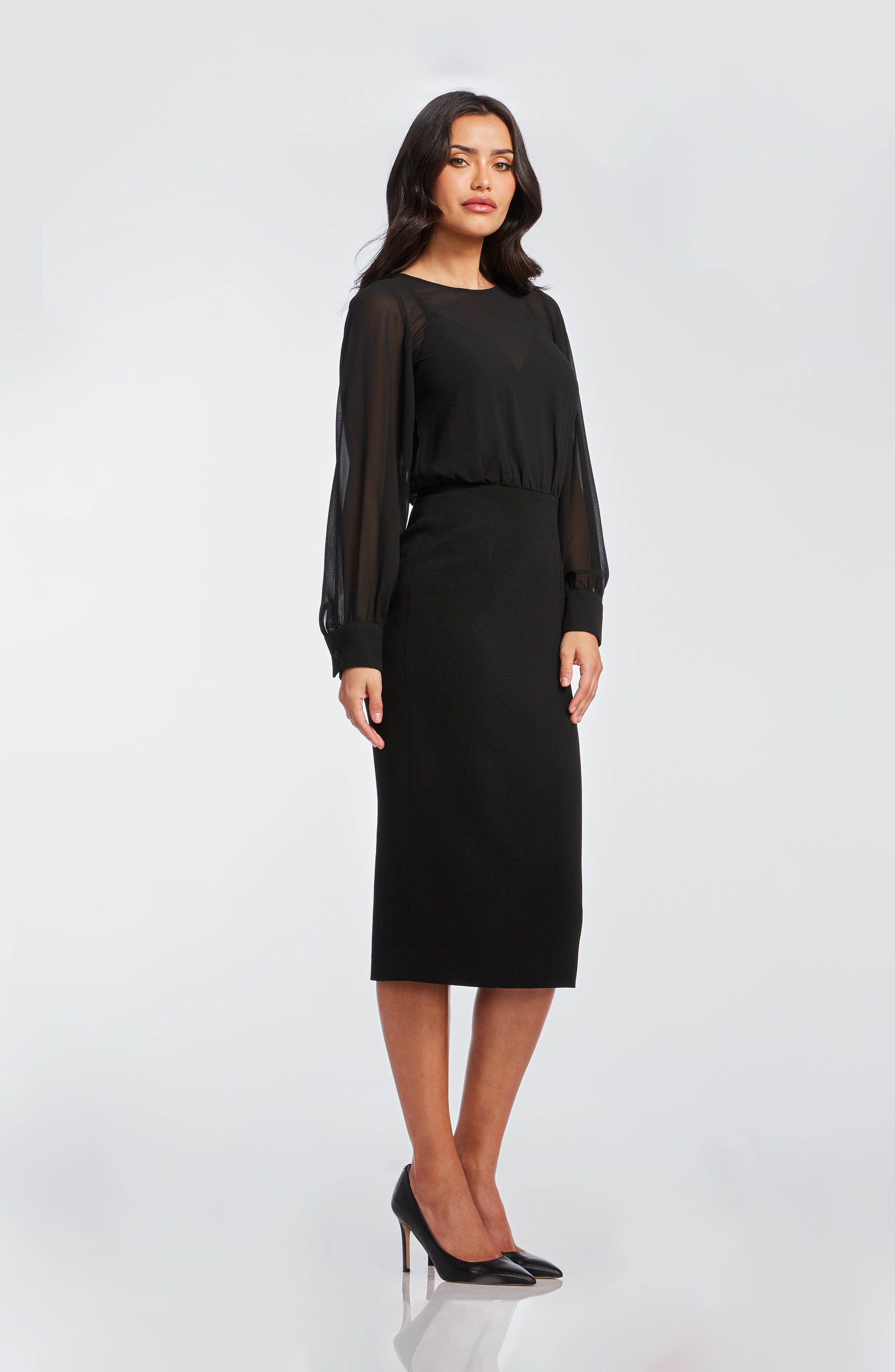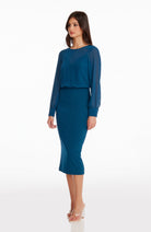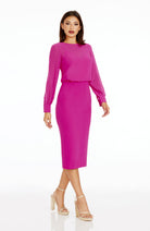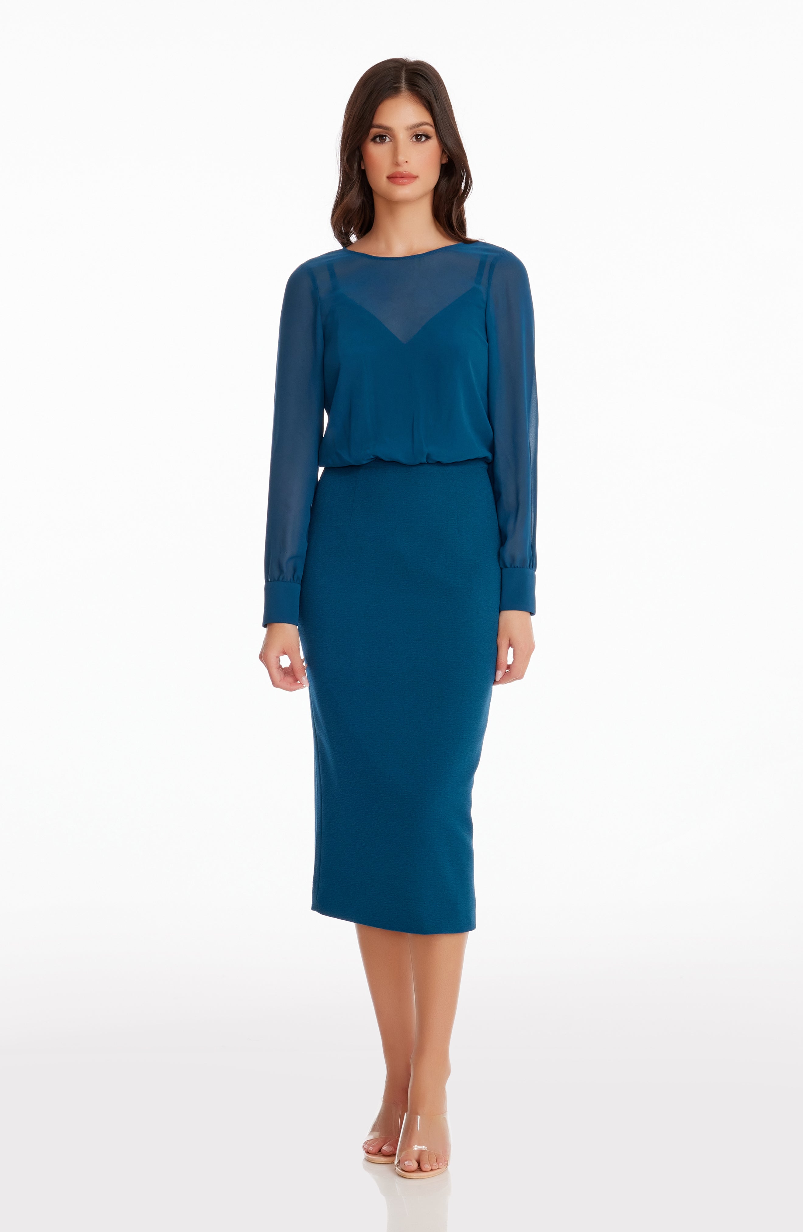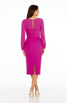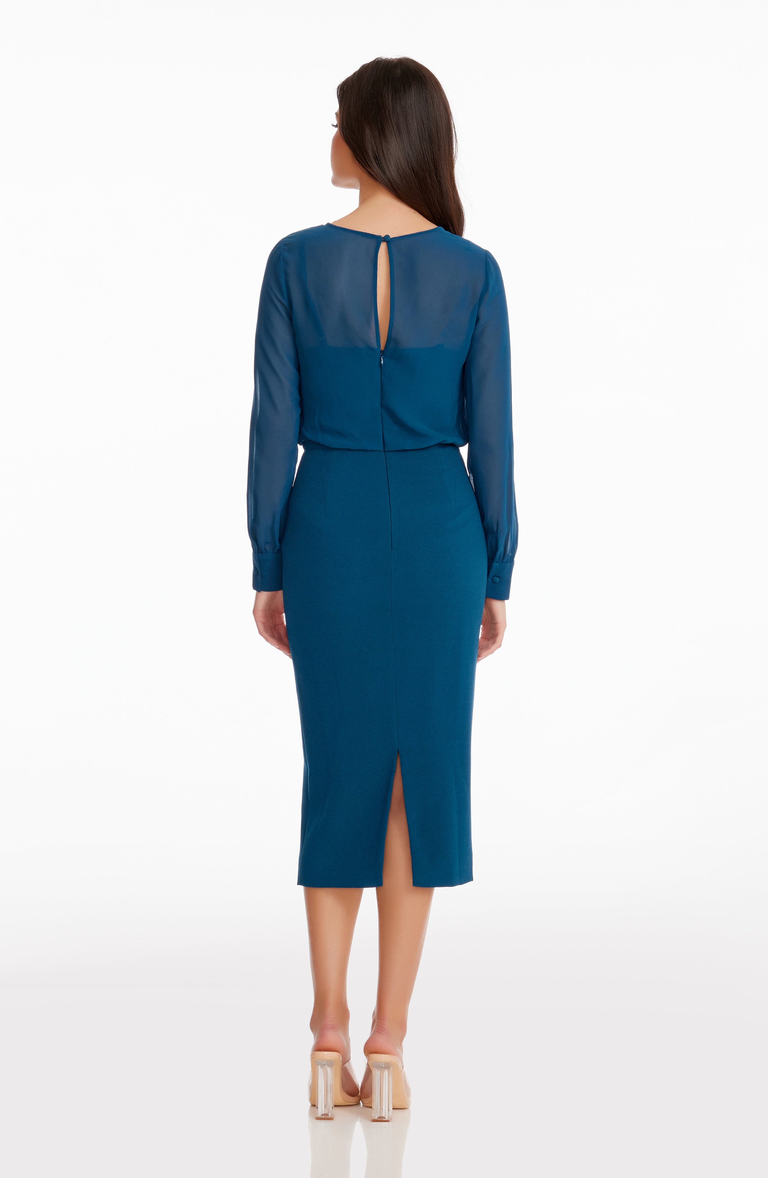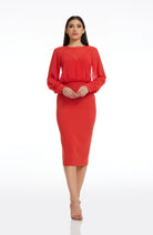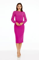 The Pilar long sleeve midi dress features a round neck and pleat bodice, creating a stylish and sophisticated silhouette. Perfect for special occasions or everyday wear.