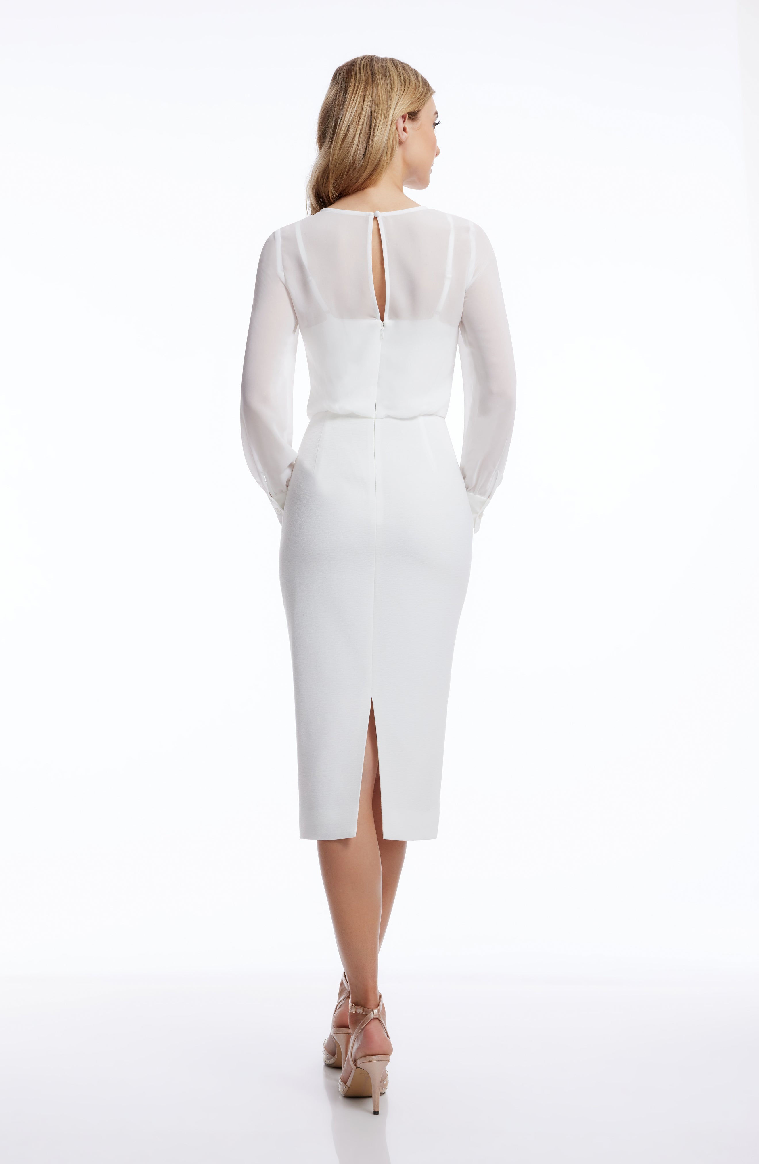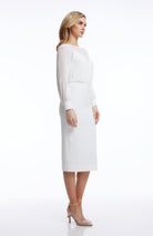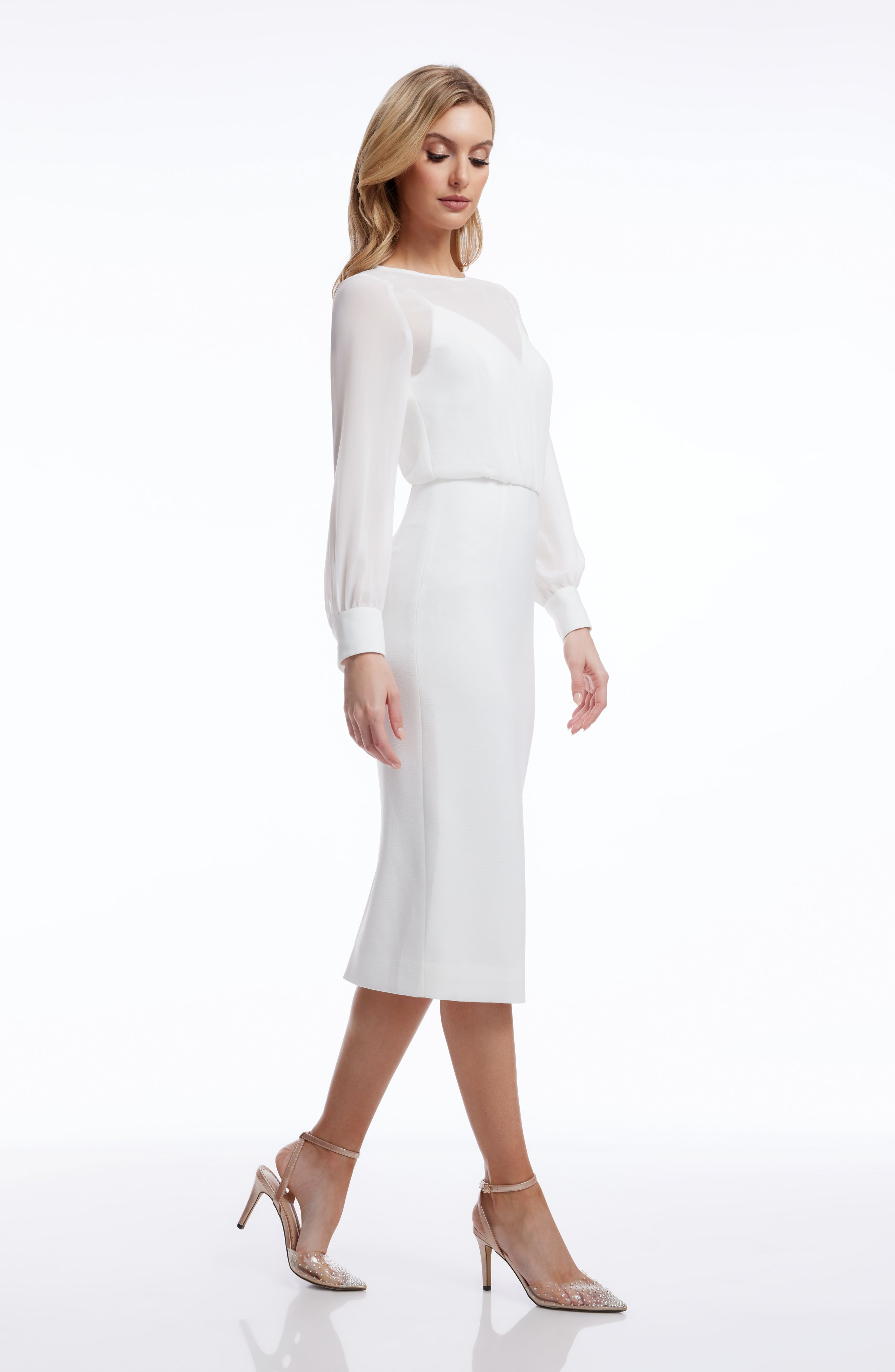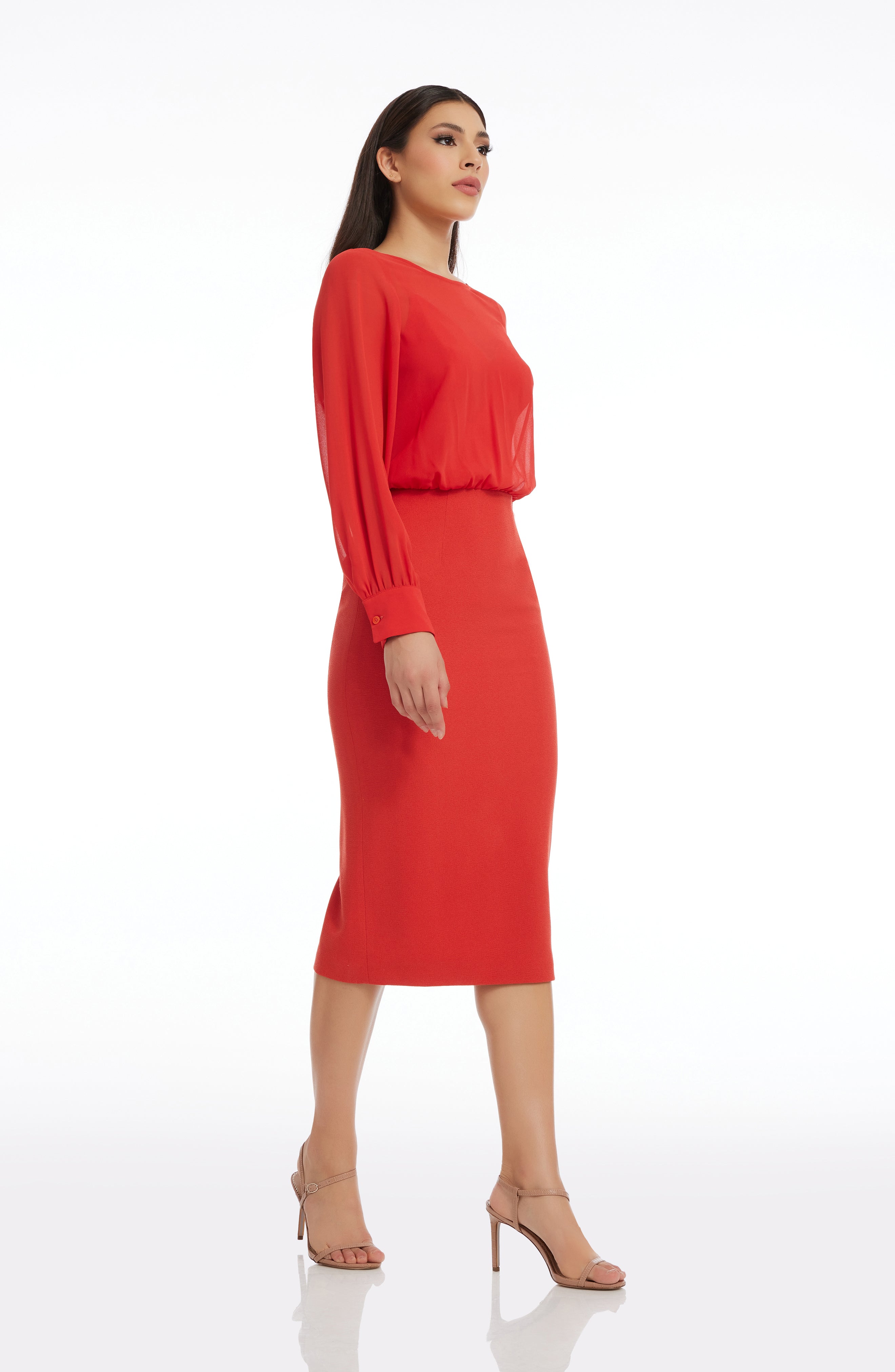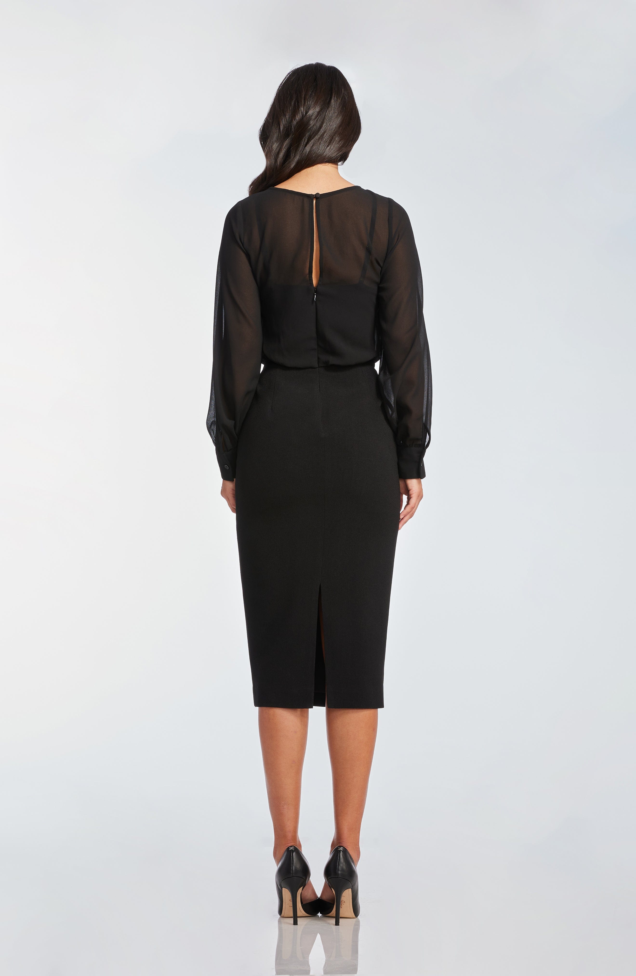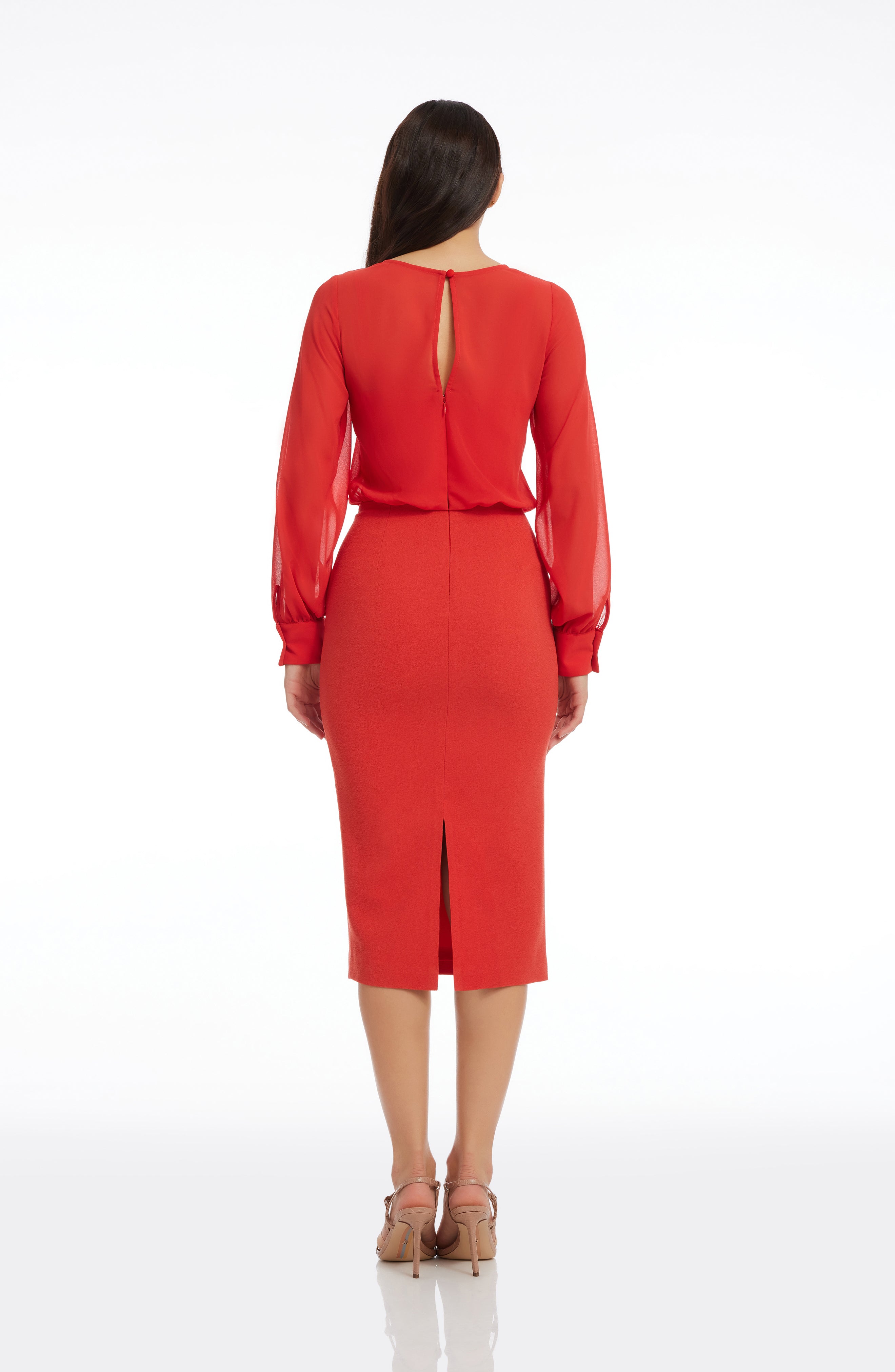 The Pilar long sleeve midi dress features a round neck and pleat bodice, creating a stylish and sophisticated silhouette. Perfect for special occasions or everyday wear.