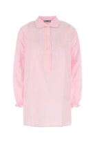 This stunning pink cotton blouse from Prada brings effortless sophistication to your everyday wardrobe. Featuring a classic shirt collar, button-front placket, and long sleeves with delicately gathered cuffs, this tunic-length piece offers both comfort and style.