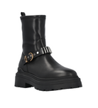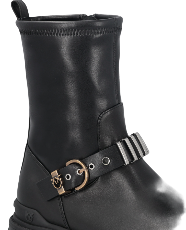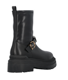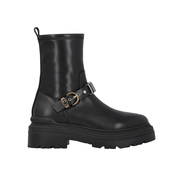 Calf-length booties in smooth leather with 5.5 cm-high rubber sole. This model in stretchy nappa leather stands out for its understated yet bold design enhanced by metal details that emphasise its character. The rear pull tab makes them easy to put on, while the adjustable front strap with buckle and metal loop bearing the Love Birds logo lends a sophisticated rock'n'roll edge.