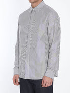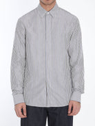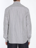 WHITE COTTON AND LINEN SHIRT WITH BLUE AND BROWN PINSTRIPE PATTERN. IT FEATURES CLASSIC COLLAR, BUTTON CLOSURE, WHITE "BV" EMBROIDERY ON THE FRONT AND BUTTONED CUFFS. REGULAR FIT.