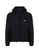 Elevate your outerwear collection with this sophisticated puffer jacket from Prada. This sleek black design features a practical hooded silhouette with a full front zip closure, making it perfect for transitional weather and beyond.