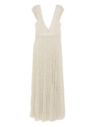 Elevate your warm-weather wardrobe with this stunning pleated long dress from Forte Forte. Crafted in a soft mint cream hue, this maxi-length dress features elegant pleating that creates beautiful movement and dimension with every step. The flattering V-neckline and sleeveless silhouette make it perfect for balmy days and sophisticated evenings alike.
