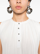 WHITE CREPE DE CHINE PLISSÉ EFFECT ROUND NECK WITH RAW-CUT EDGE SLEEVELESS RUFFLE HEM SILVER-TONE BUTTONS SHORT FRONT BUTTON FASTENING